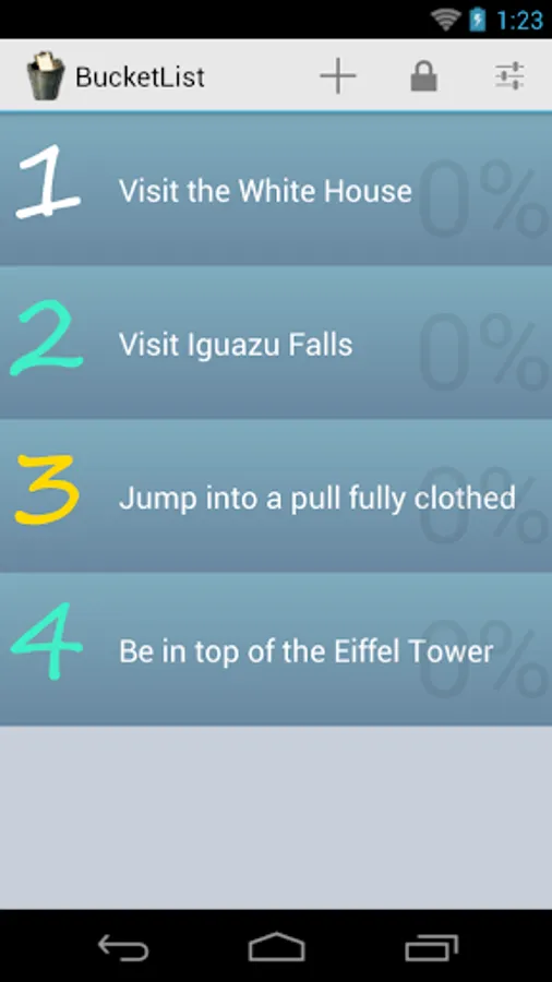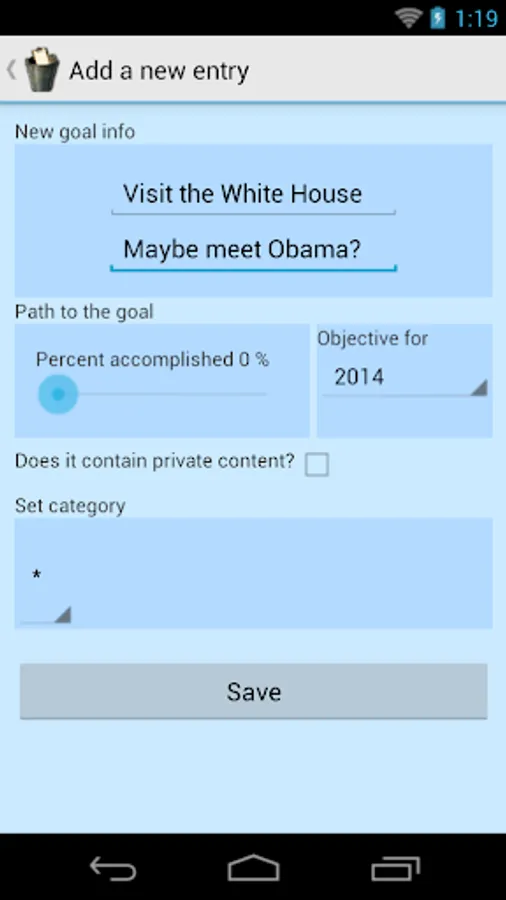 Bucket List will help you keep that information. You will be able to add comments to your goals, add new goals, delete, and to save private goals.