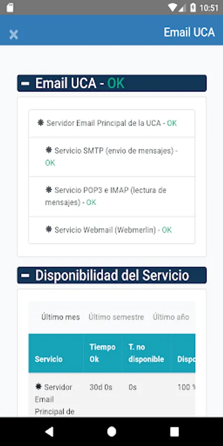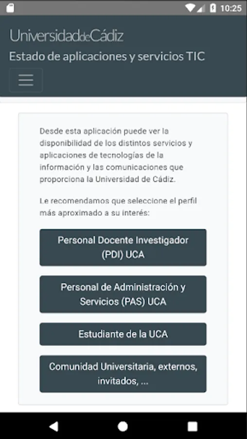 From this application you can see the availability of the different services and applications of information technology and communications provided by the University of Cádiz.