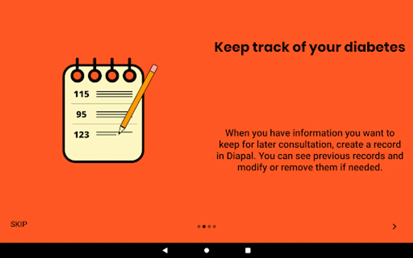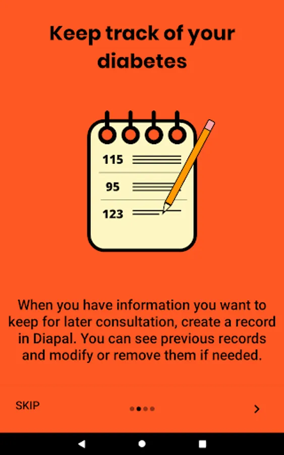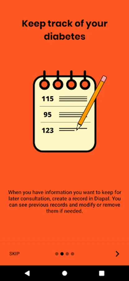 The main way in which it is intended to help is by registering information related to diabetes (glycemia, carbohydrates, insulin, etc.) so that it can be consulted in the future.