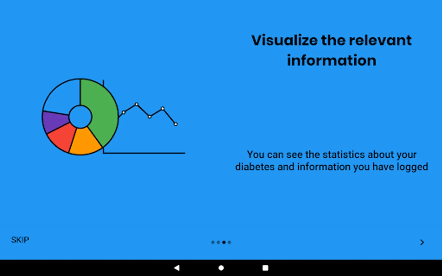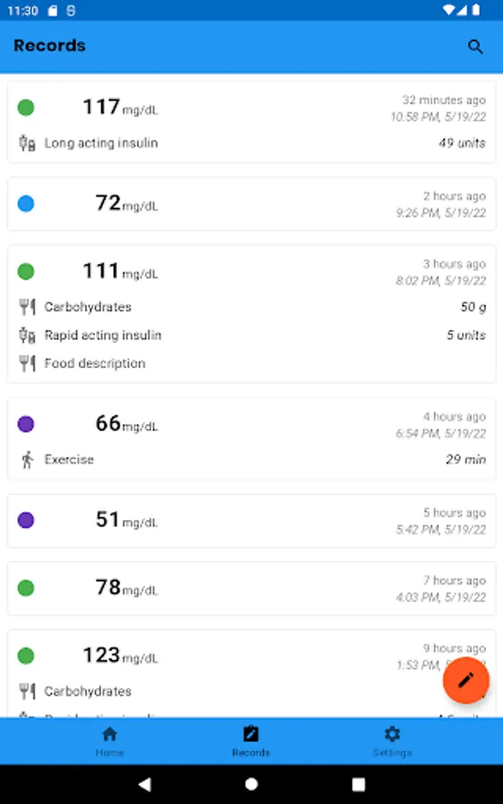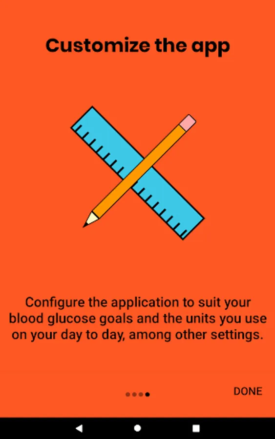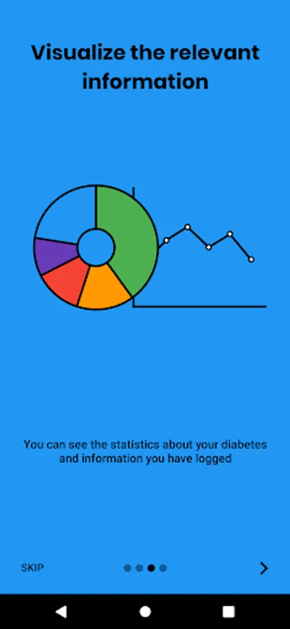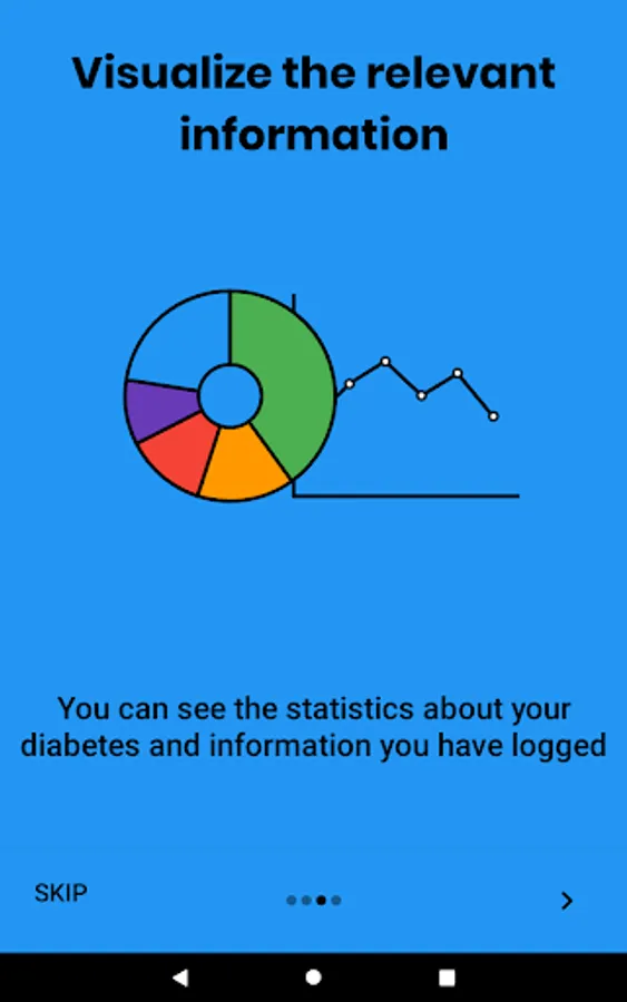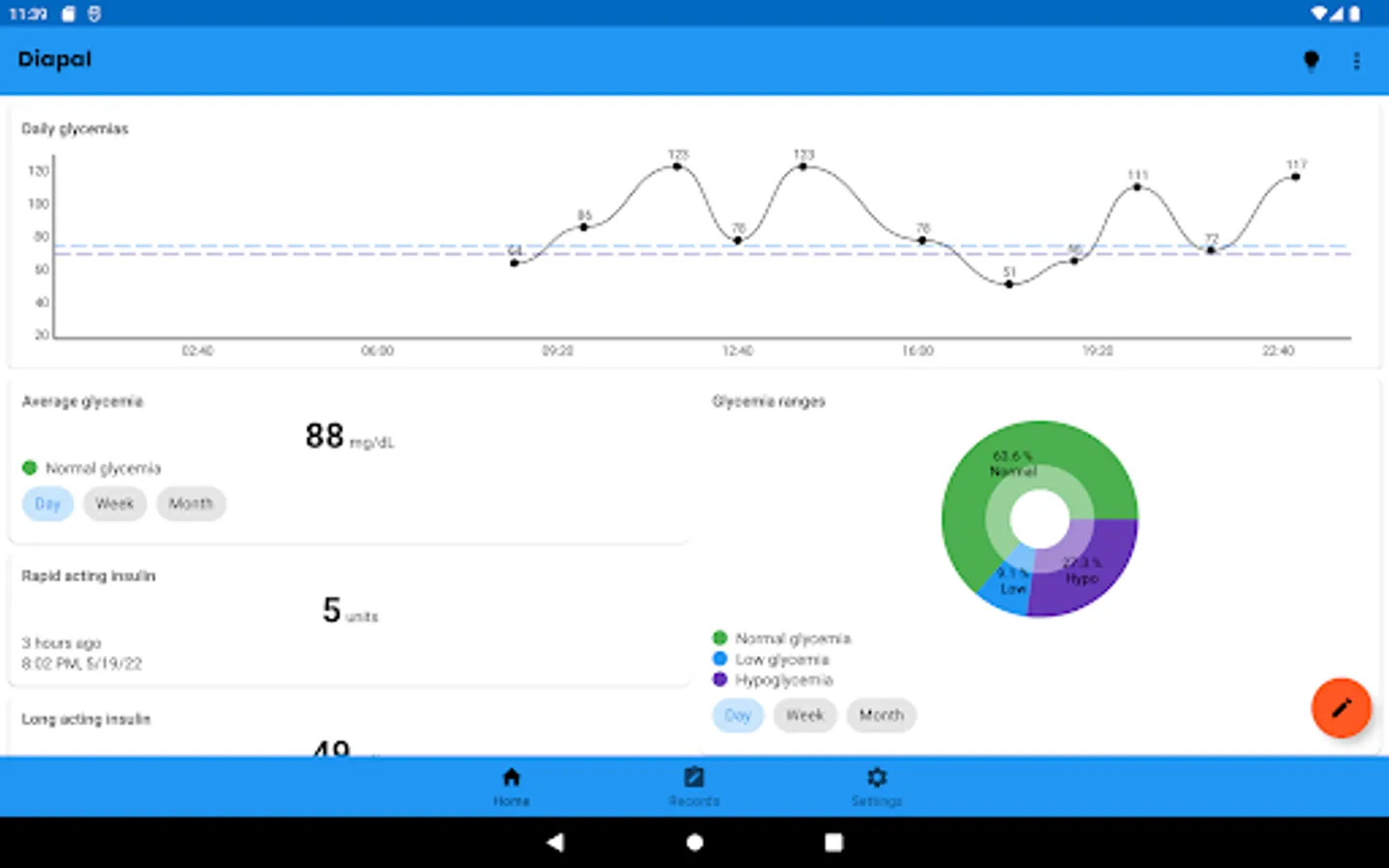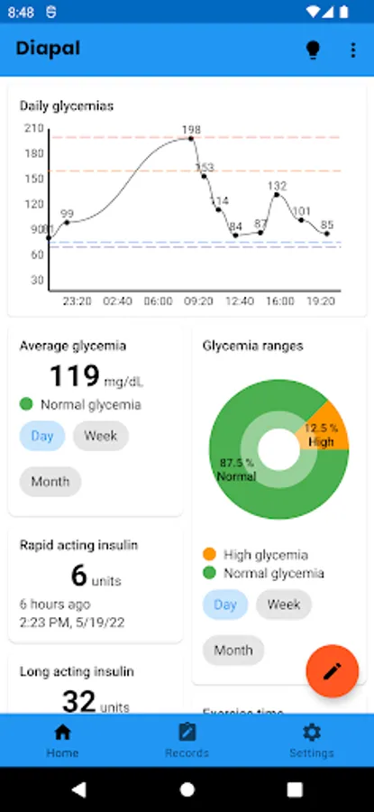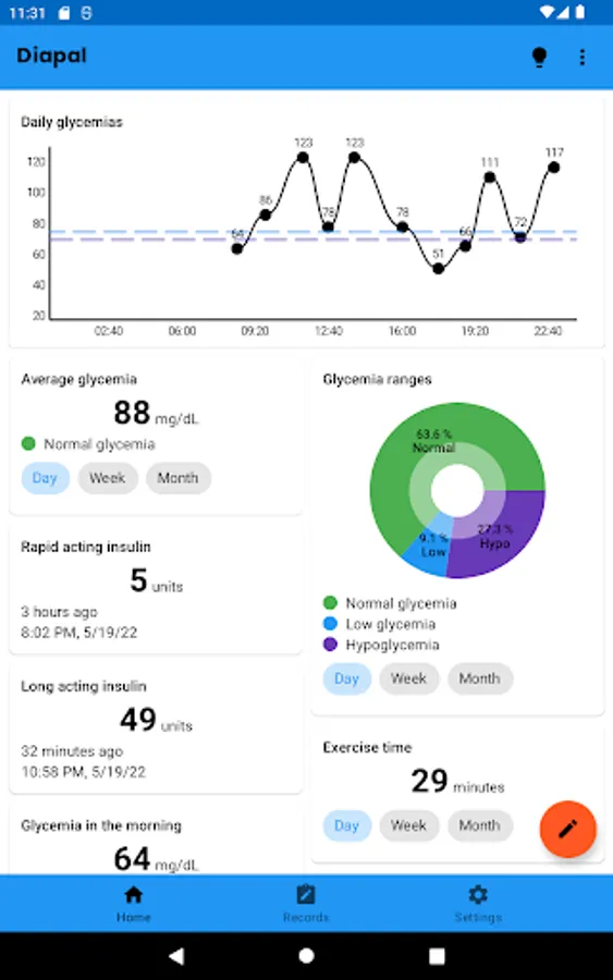 On the main screen of the app, graphs are shown based on the data that the user has registered in order to present all this information in a summarized way and give an idea of how their diabetes treatment is developing.