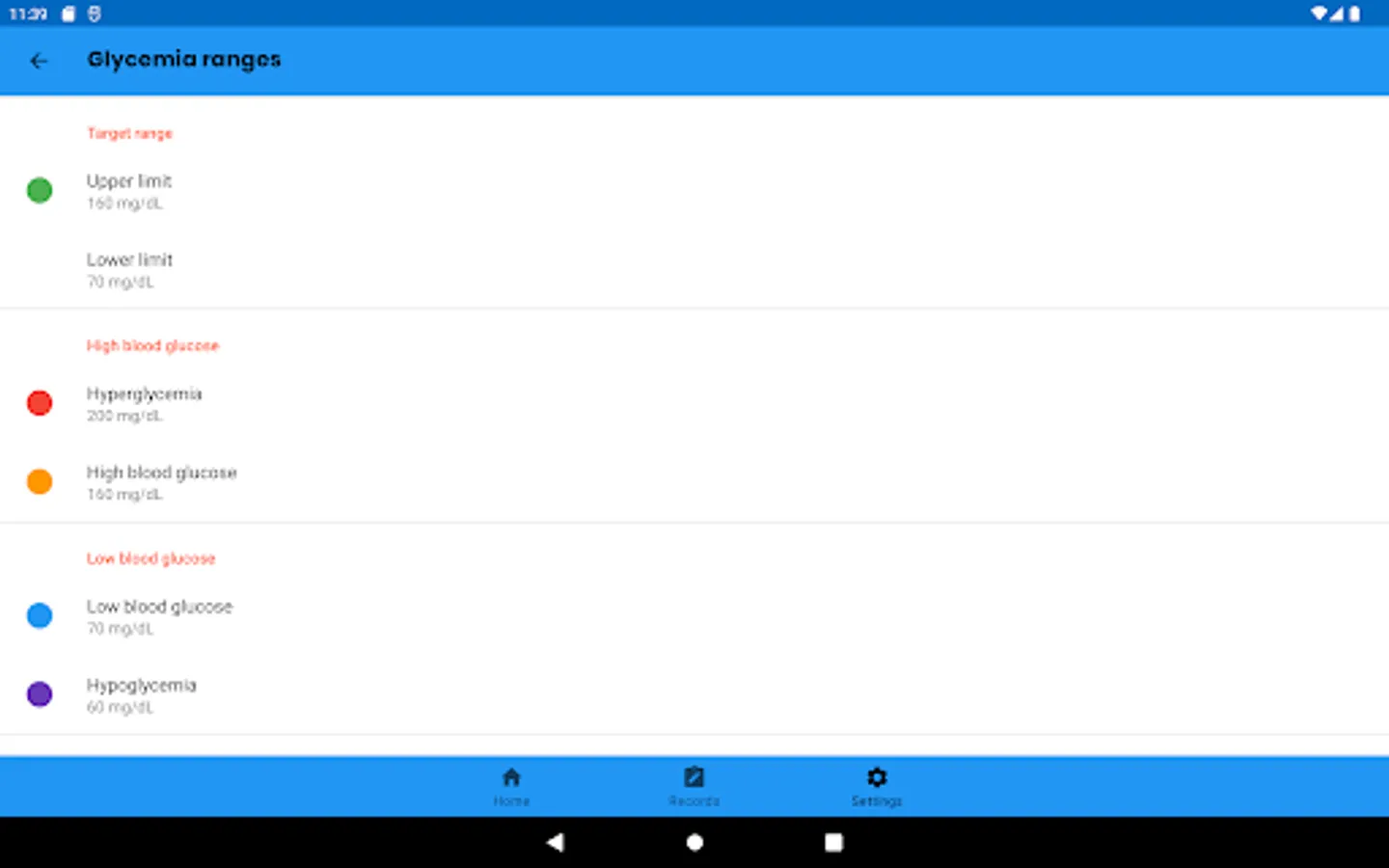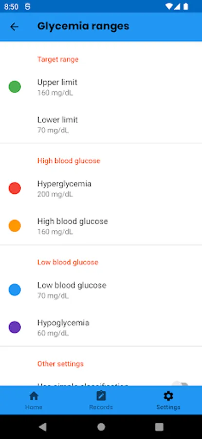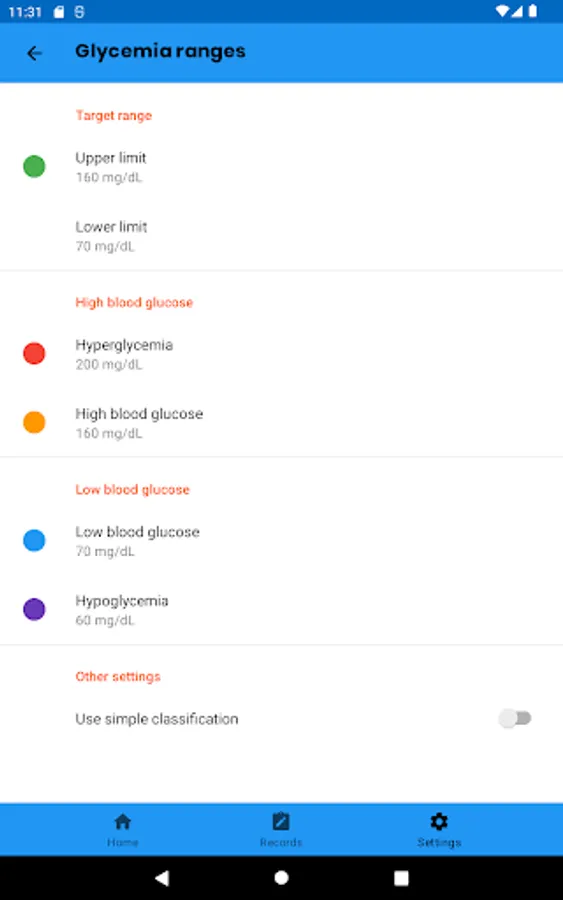 To adapt the way that the recorded information is presented, you can select the units of measurement that you want to use for the different types of data (glycemia, carbohydrates and glycosylated hemoglobin).