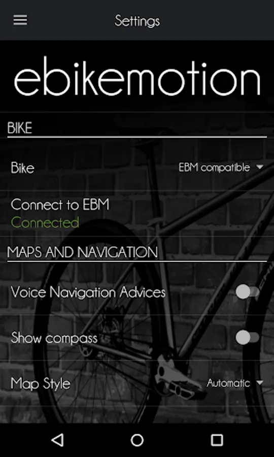 ebikemotion® APP is one application to be used in combination with one smartphone as bicycle computer for standard or electric bicycles (e-bikes). It uses a widget technology and allows users to completely set up the information they need to see. Using OpenSource systems for navigation (OpenStreetMpa) and Weather (OpenWeather)