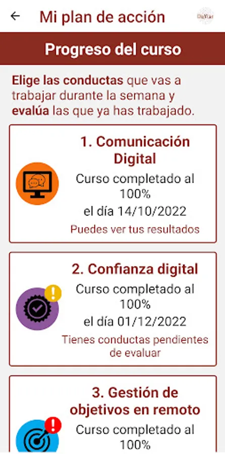 completed each of the five courses (digital communication, digital trust, remote goal management, relationship development in virtual environments, telework-personal life balance). When accessing the App, the first step is to select the behaviors that you want to practice, from 2 to 4 (name). The second step is to put them into practice during the week following the end of the course (apply). Finally, a self-evaluation of the implementation of the plan is carried out. The App issues reminders
