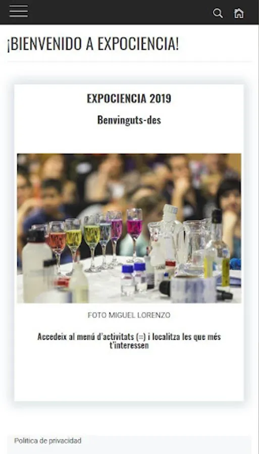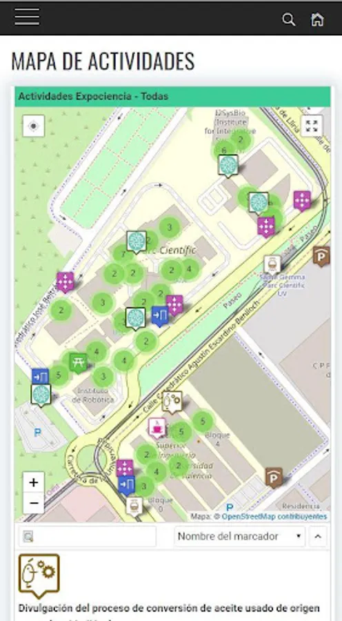 List and maps of activities of the Expociencia days of the Parc Cientific and the ETSE-UV.