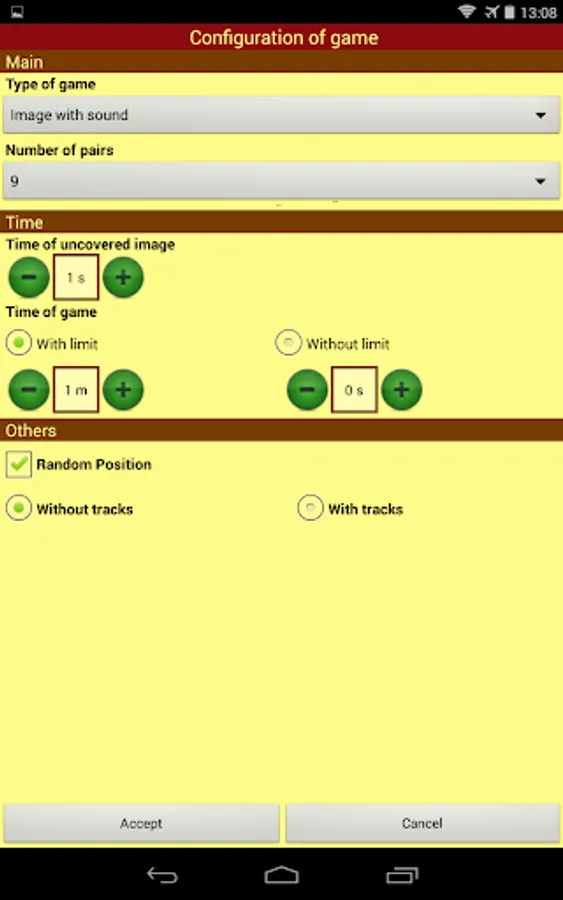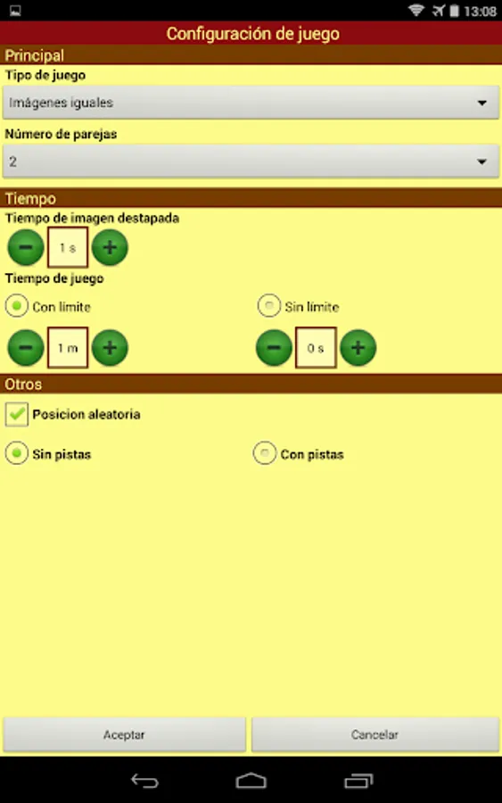 This application makes possible to create games matching same images, same sounds, same texts, associated images, image with sound (using audio files or voice synthesizer), image with text and text with sound. You can set the number of pairs from 2 to 15, a maximum time to finish the game or the possibility of a configurable number of hints. Finally, it also allows you to create sets of grouped games or individual games. It is available in Spanish, English, German, French, Italian and Galician.