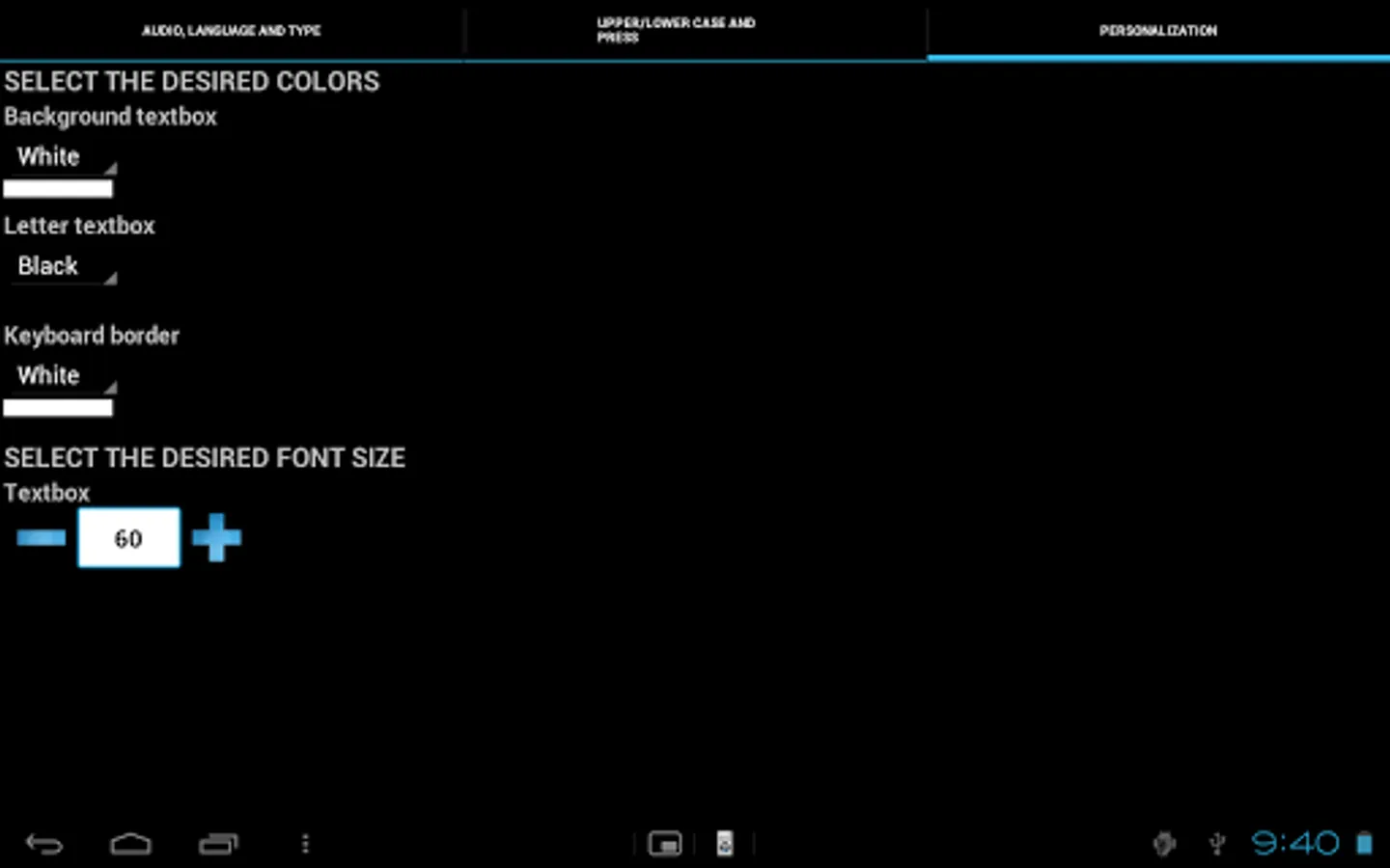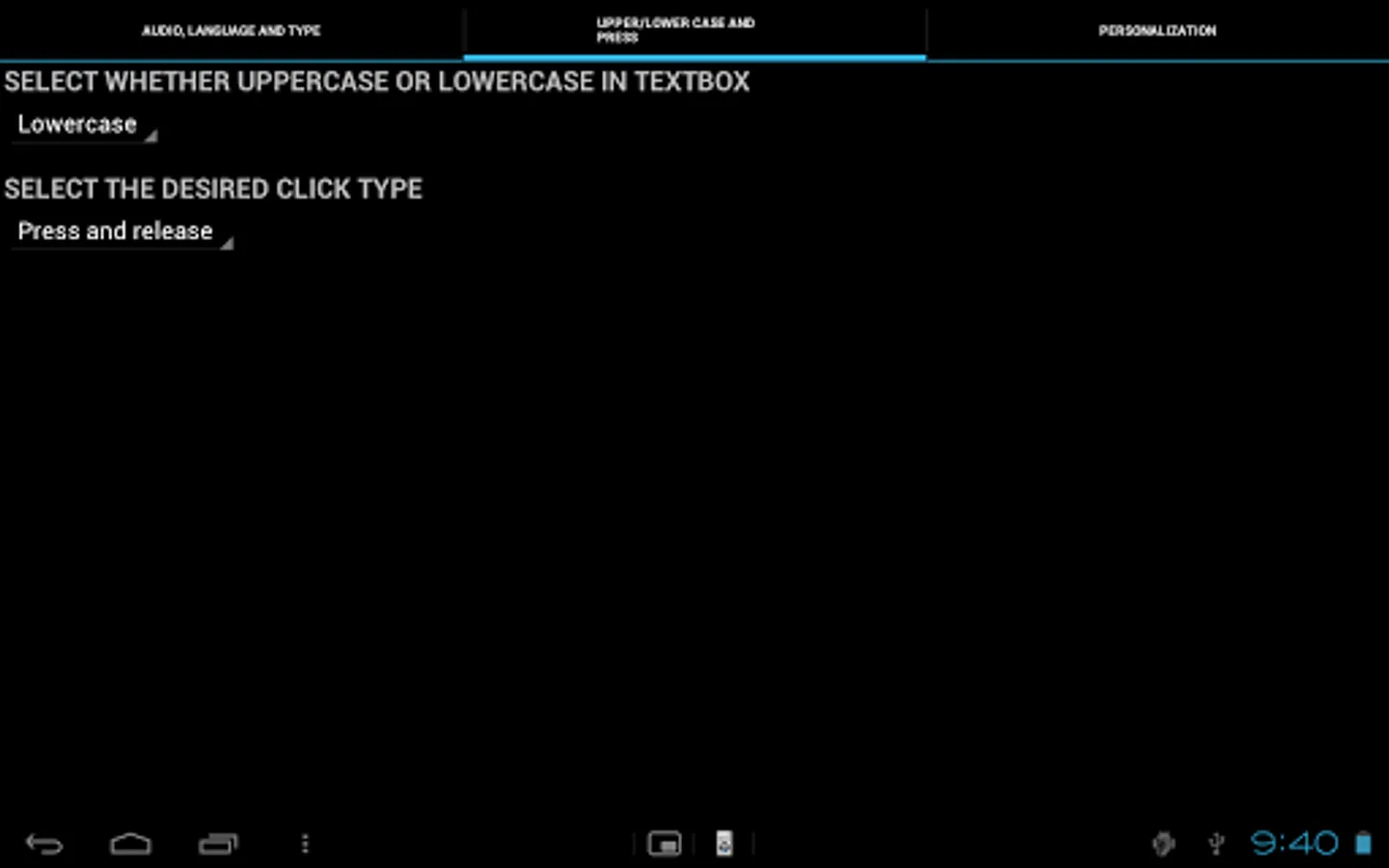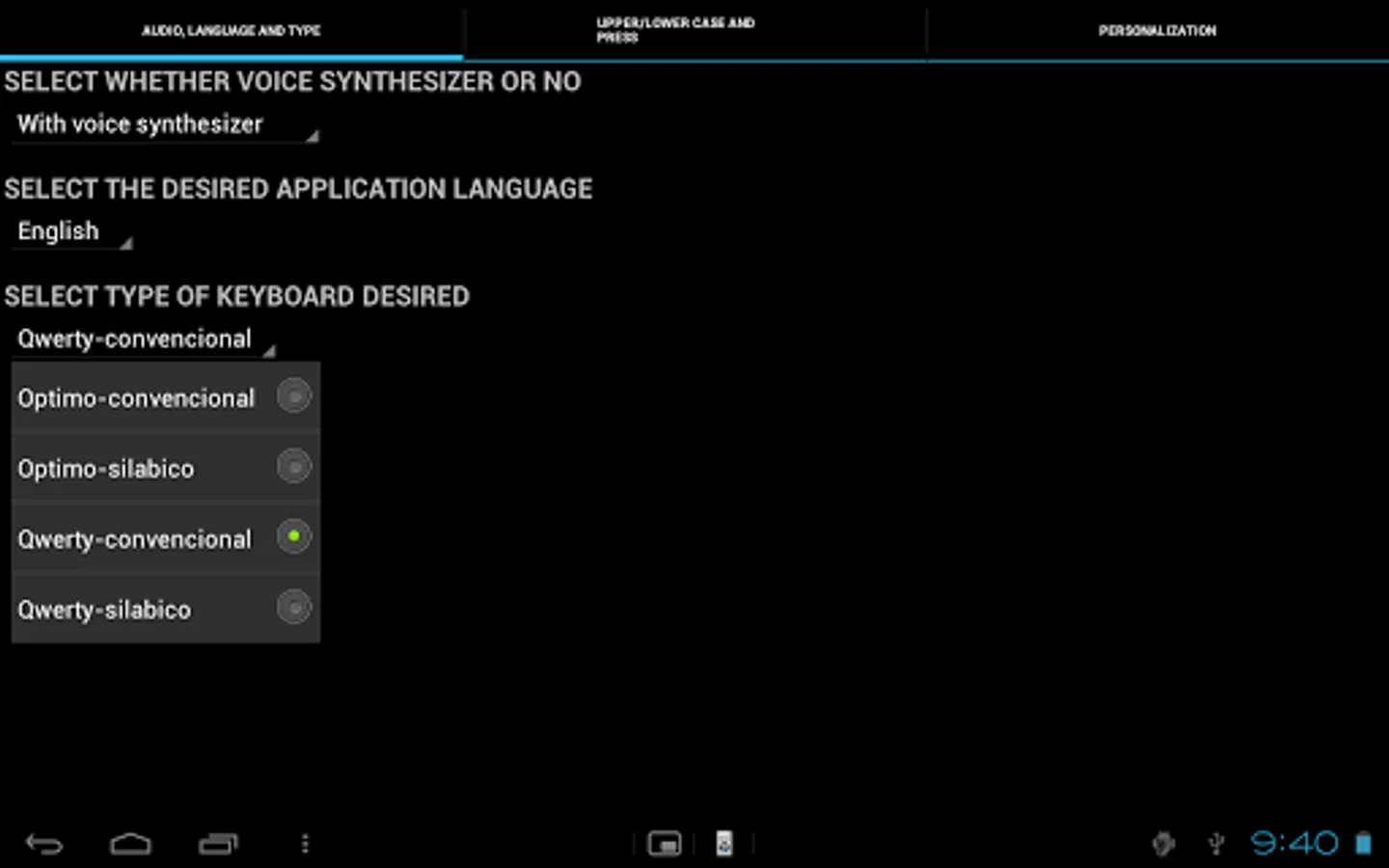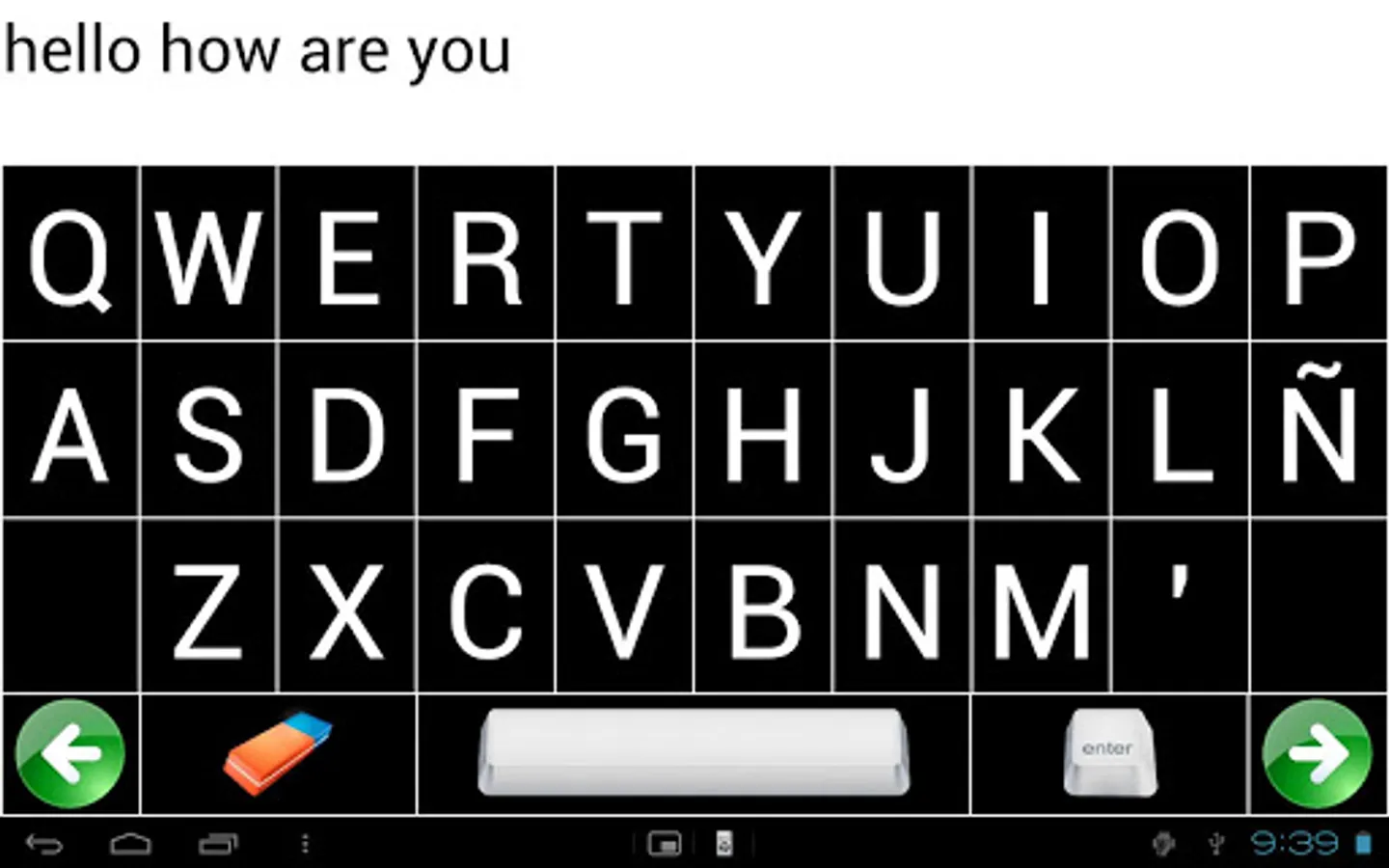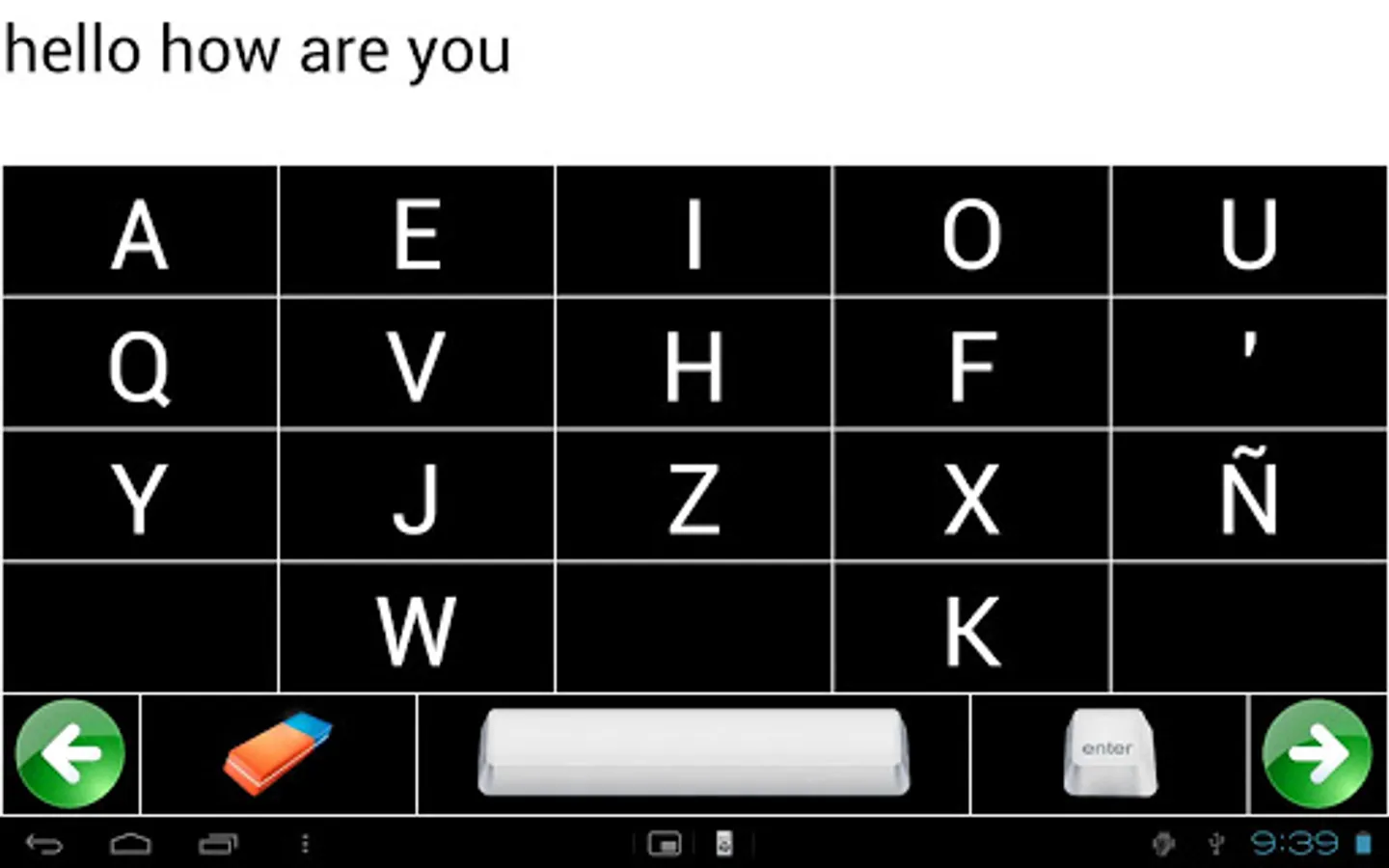 MyKeyboDroid is a text-to-speech based on a dynamic keyboard. It allows people physically impared writing and speaking. It also facilitates the acquisition of literacy skills by young children or with difficulties. By default it has a QWERTY keyboard and an optimized keyboard with most frequent letters easily clickable. It also allows two types of writing: syllabic and letter by letter.