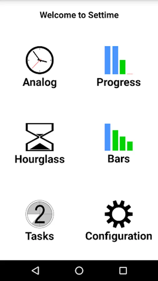 The counters types are: analog, progress, hourglass, bars and tasks. All counters are highly configurable, as well as the aspect appearence of the whole app.
