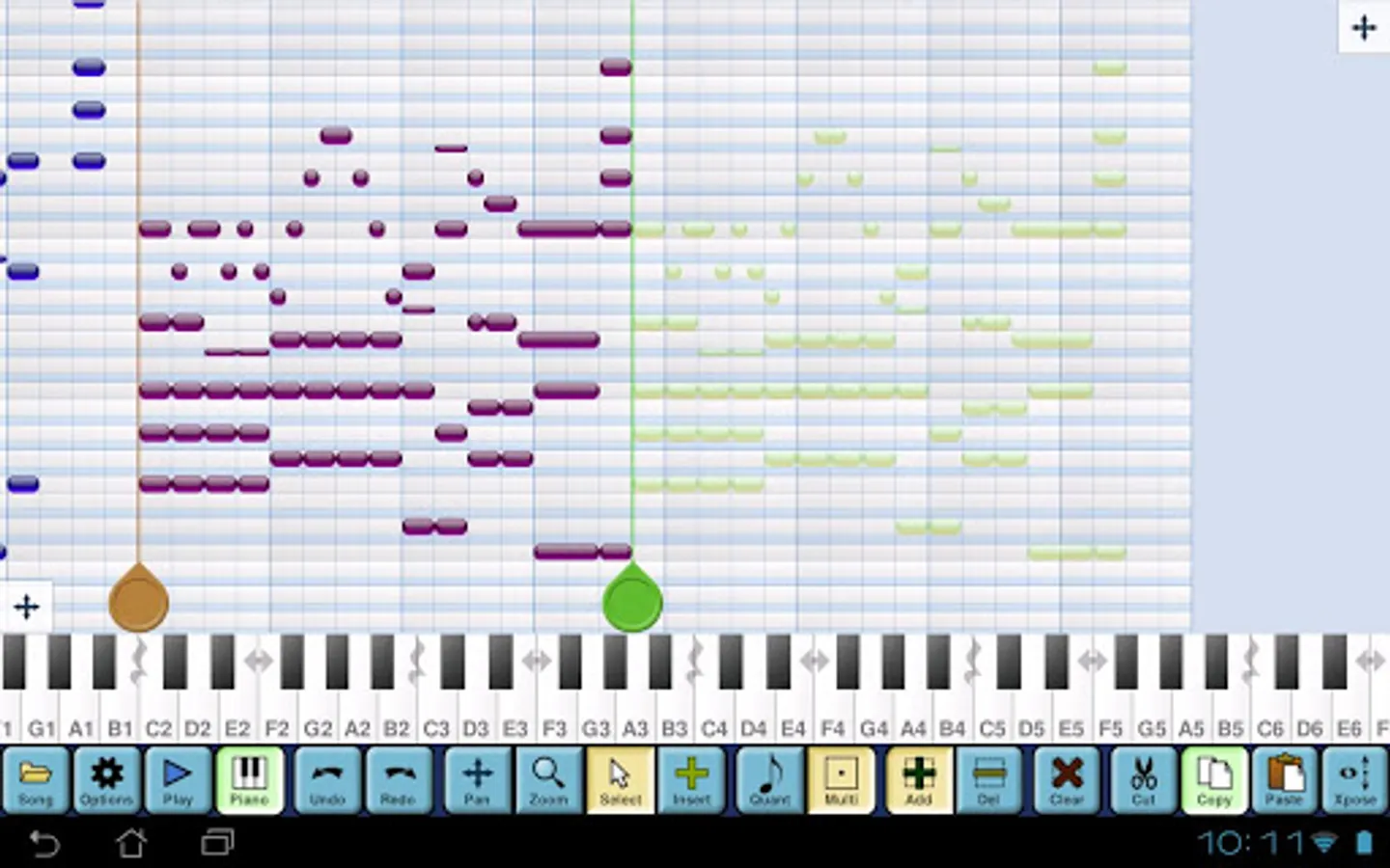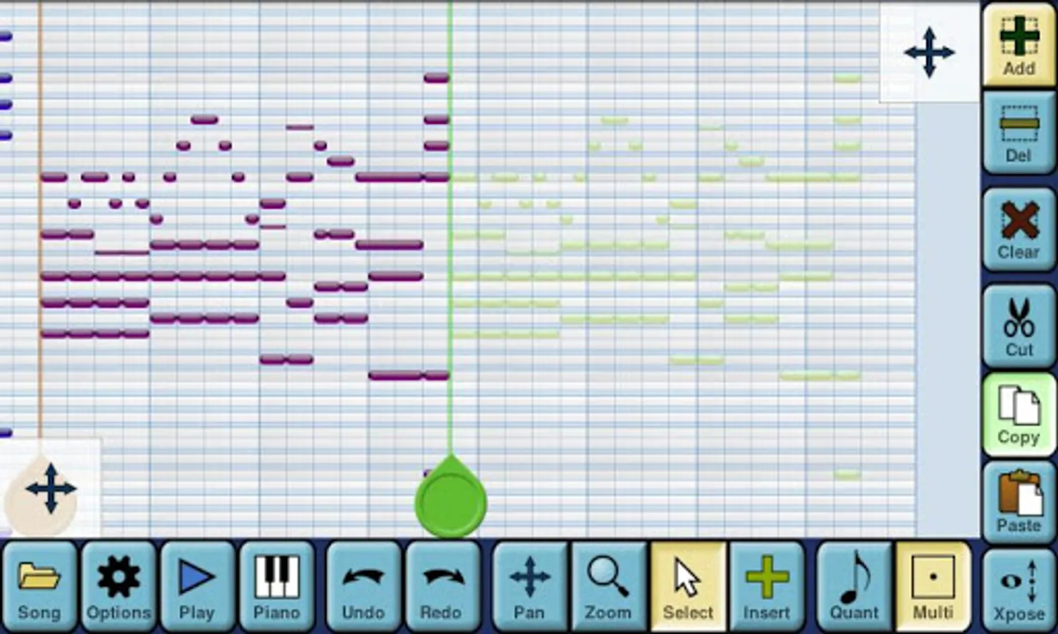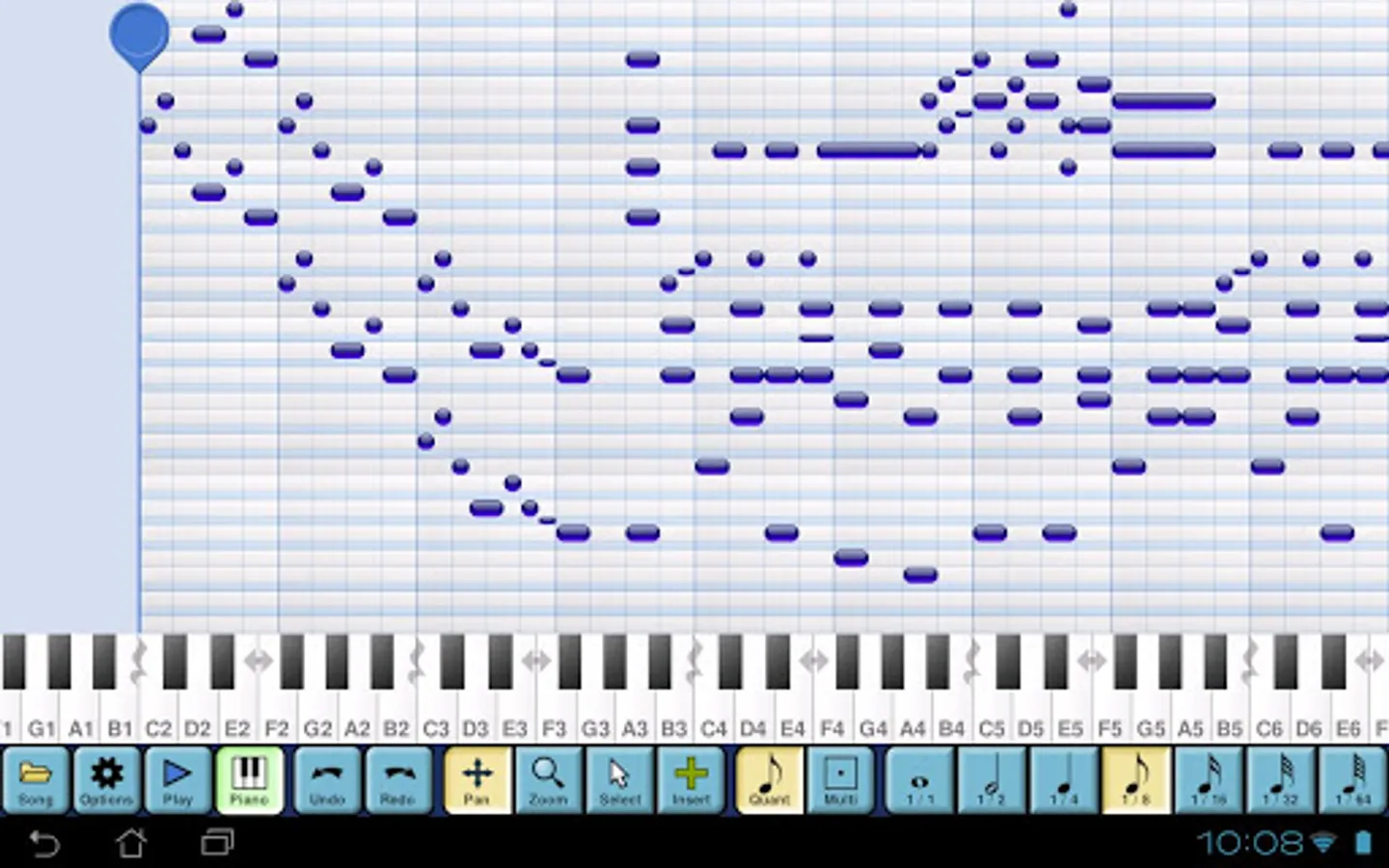 MusePad uses a piano roll style grid for displaying notes, and a piano keyboard for input. You enter the notes using the piano and they appear on the note grid. After that, you can delete notes directly on the grid, or add more notes tapping on the grid.