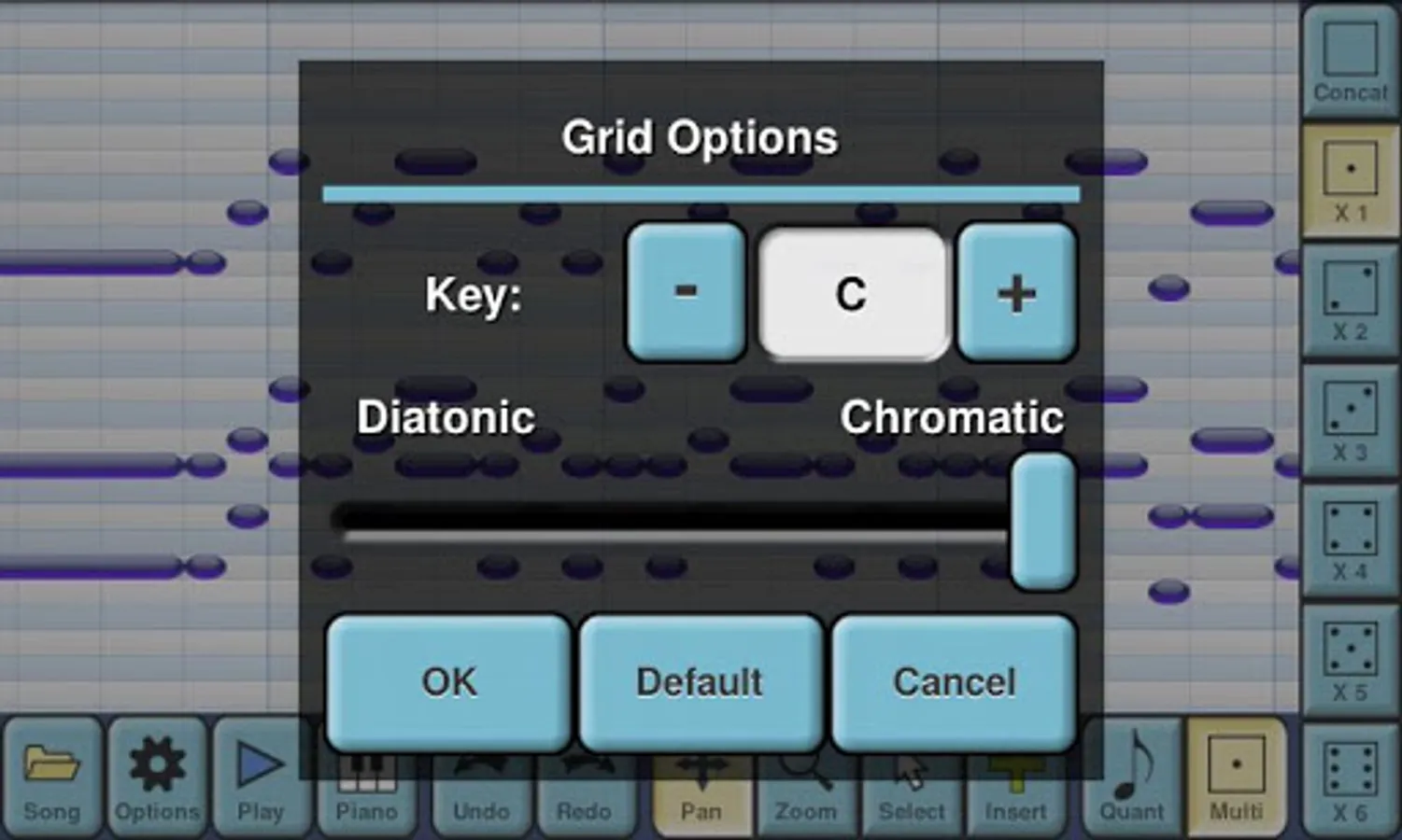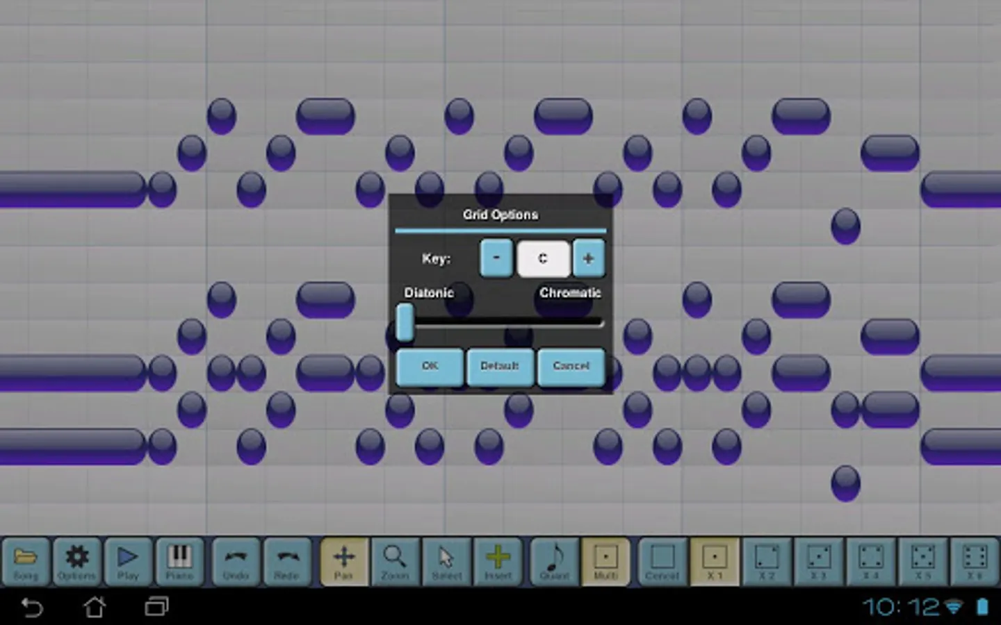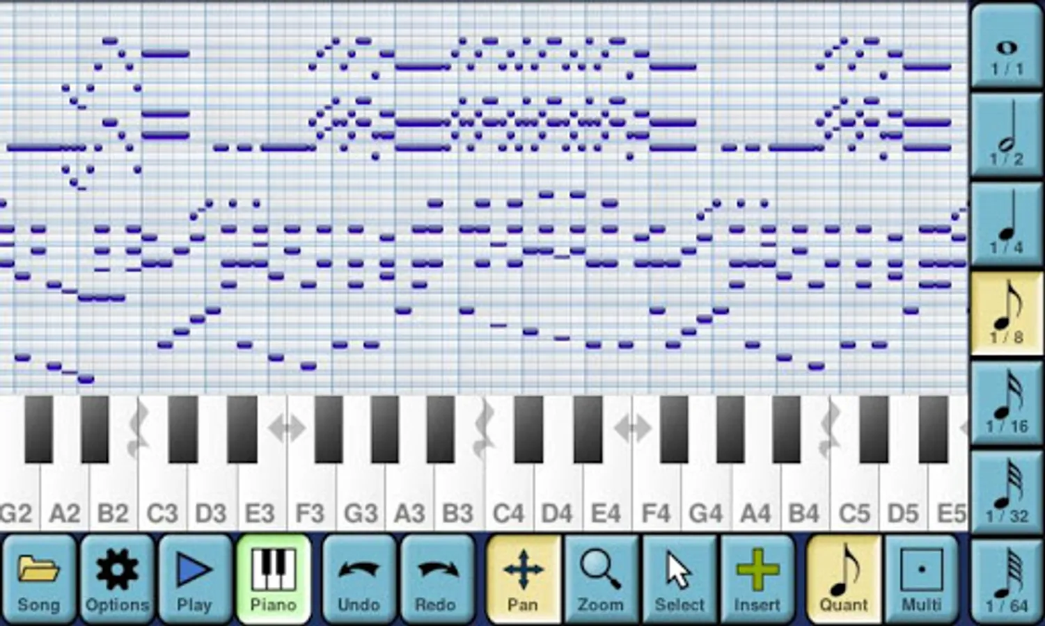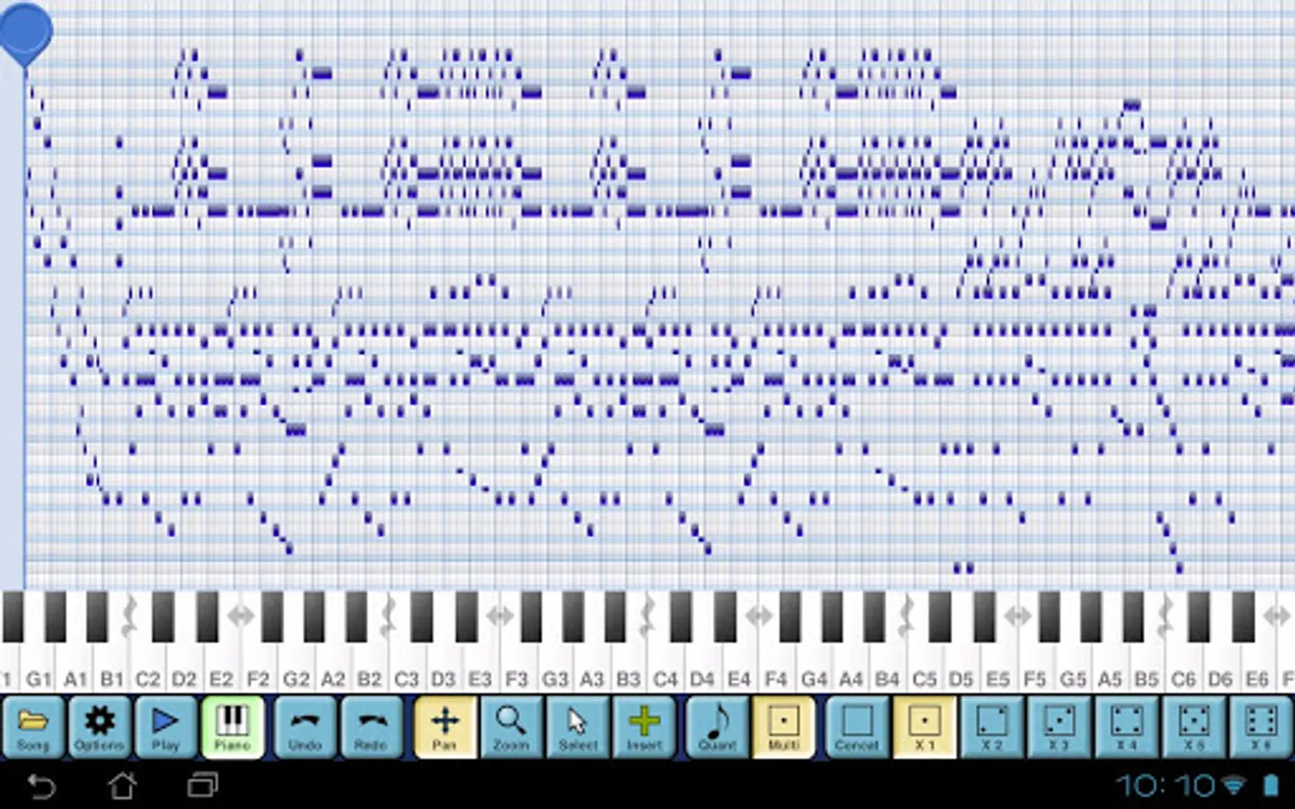 MusePad uses a piano roll style grid for displaying notes, and a piano keyboard for input. You enter the notes using the piano and they appear on the note grid. After that, you can delete notes directly on the grid, or add more notes tapping on the grid.