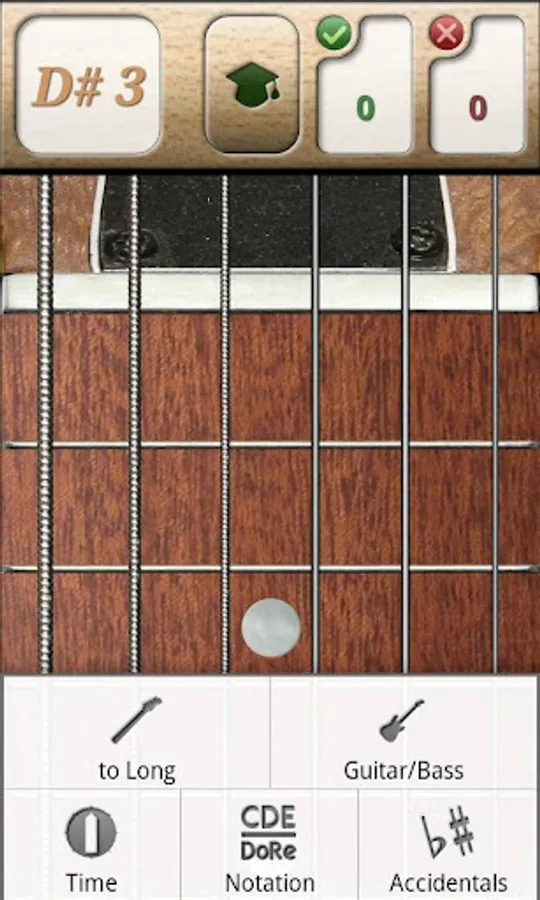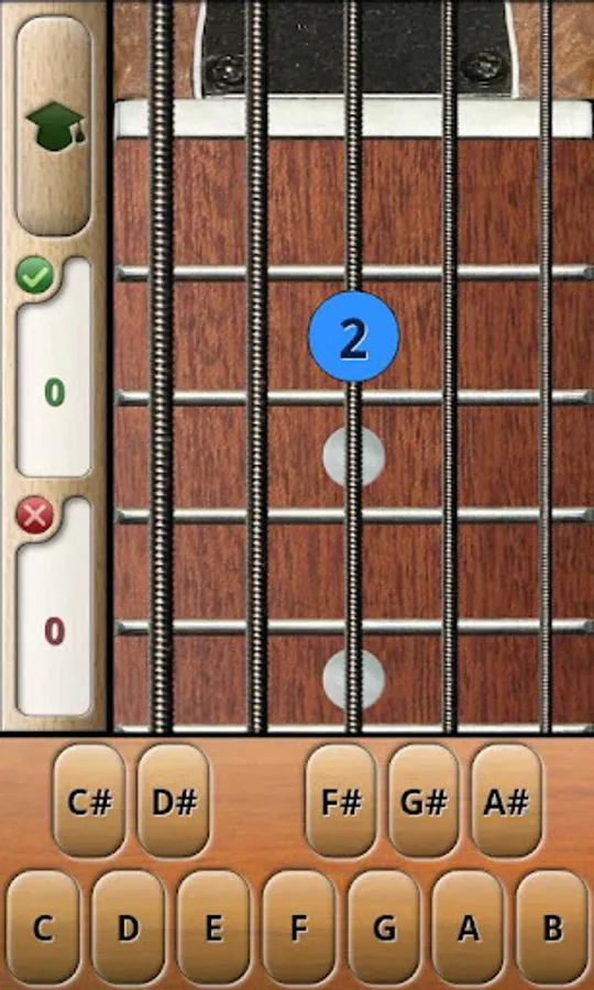 The game shows a position on the fretboard. The goal is to enter the correct note for that position. If it is correct, another question is made.