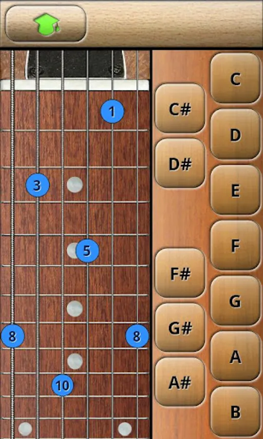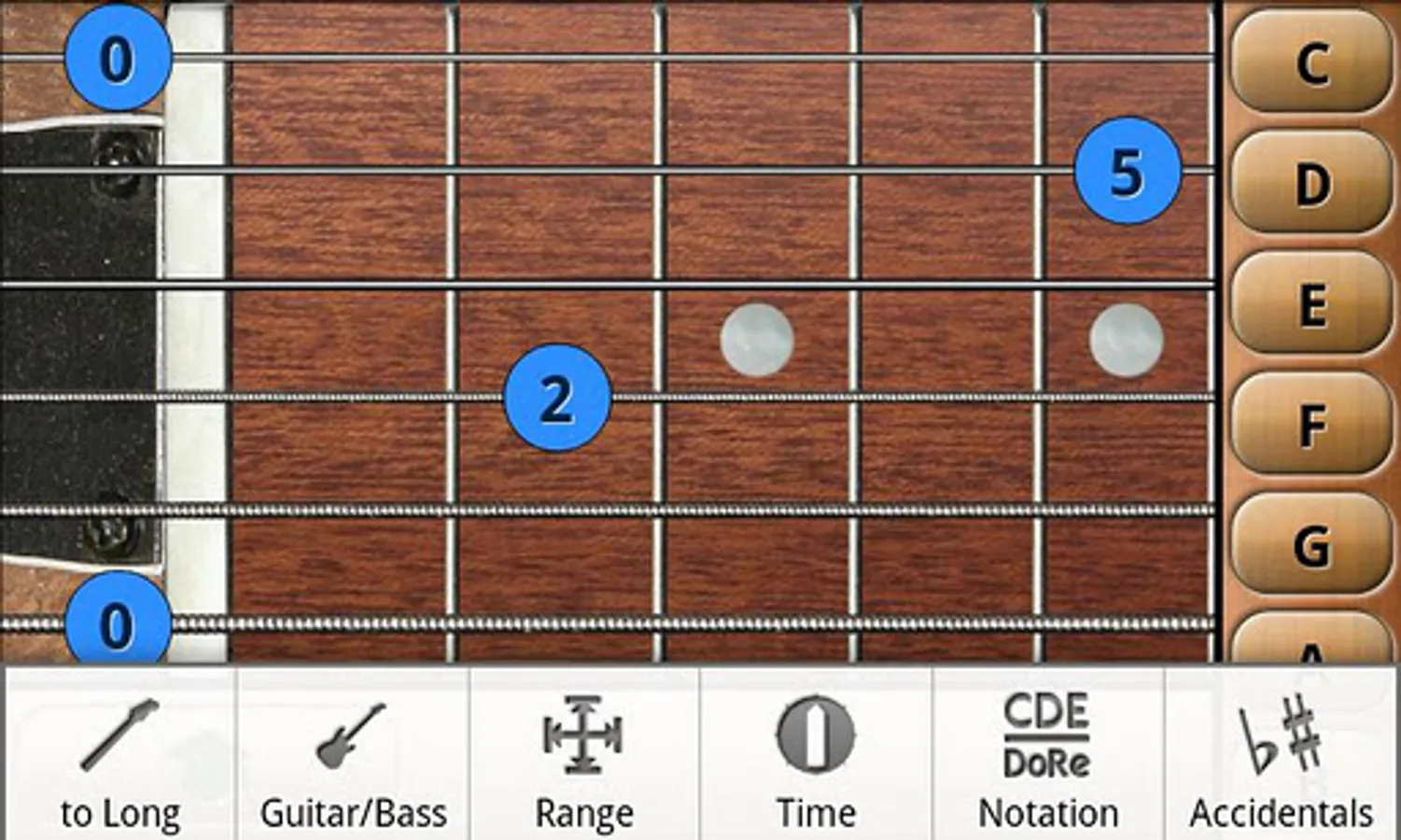 There is also a second game available, 'play'. The game presents a note (including octave number). The goal is to position the note correctly on the fretboard.