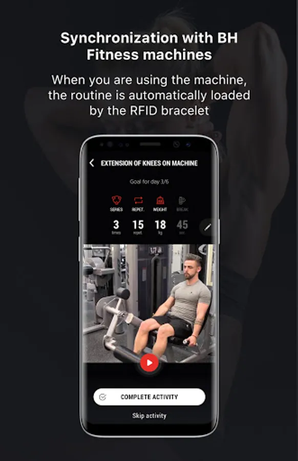 This synchronization will occur automatically with the BH Fitness machines, simply by approaching the RFID bracelet, this gives you the capability to concentrate on your exercises and not have to waste time typing.