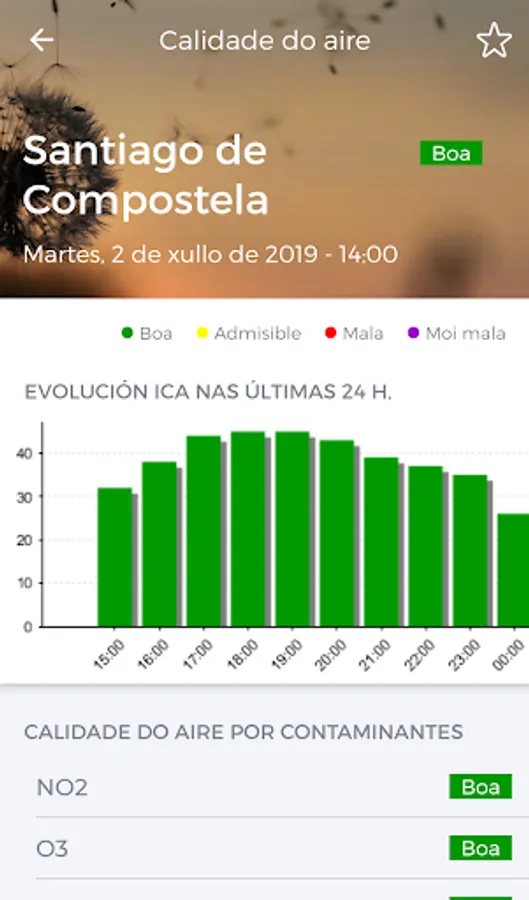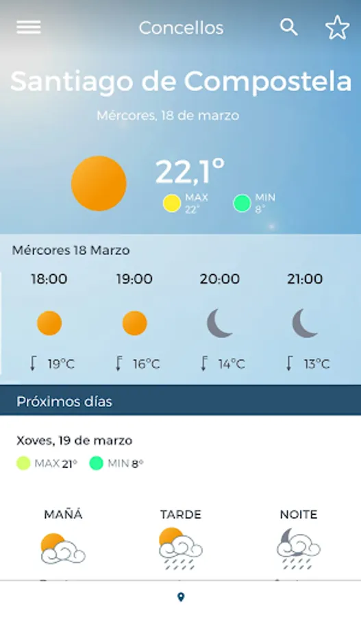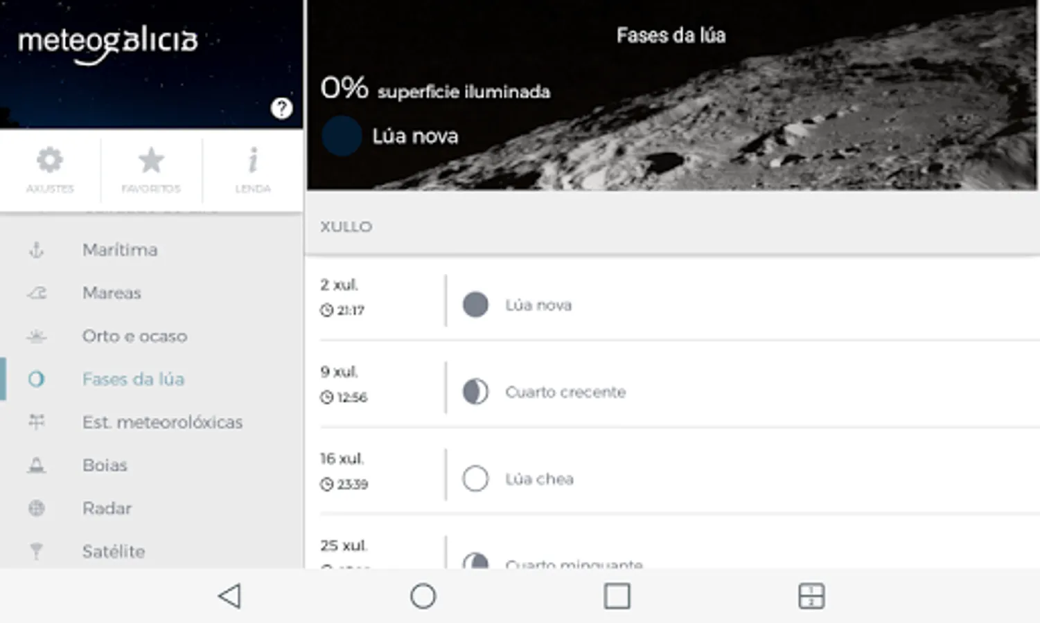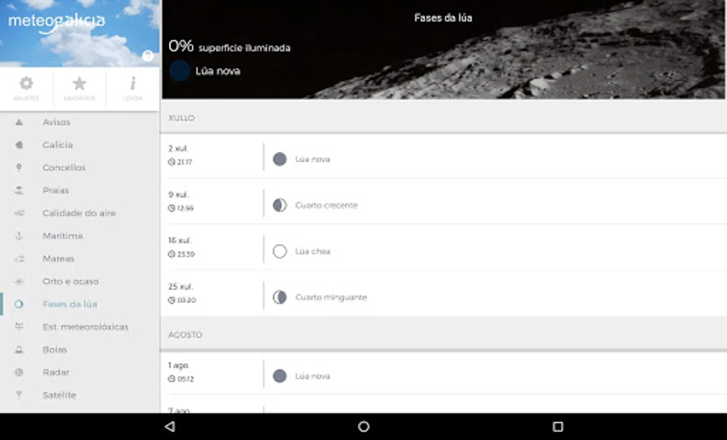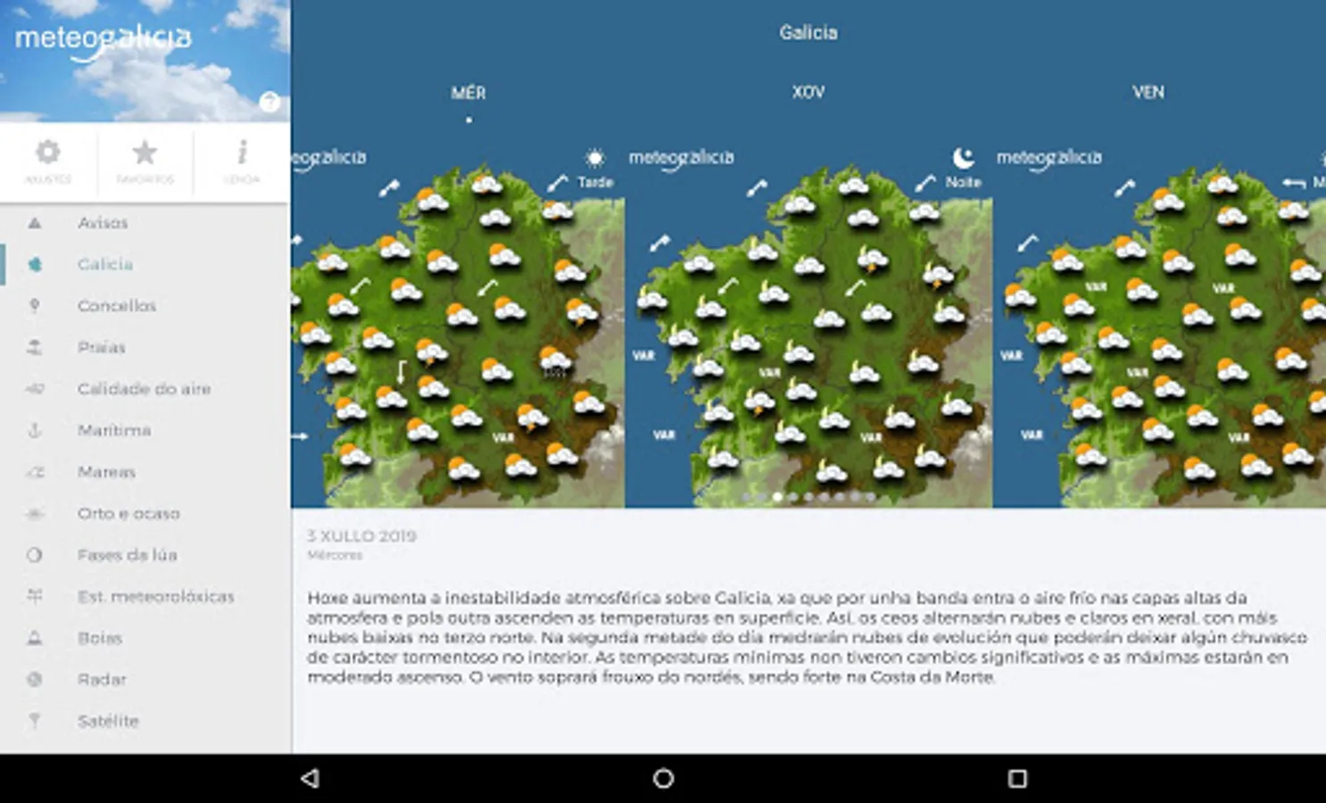 Meteogalicia official application offering detailed information on a prediction by concello meteorolóxica os next 10 days, or do sea state, predicións for all praias as Galicia xeral prediction and tides.