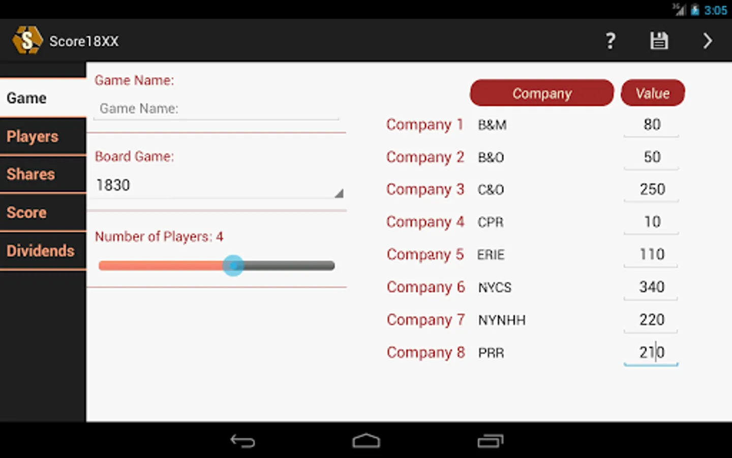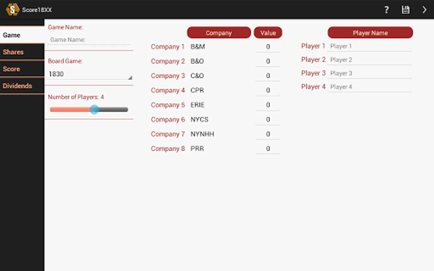 - You can indicate the 18XX game (1830, 1853, Steam over Holland) and it is charged the default companies of the game