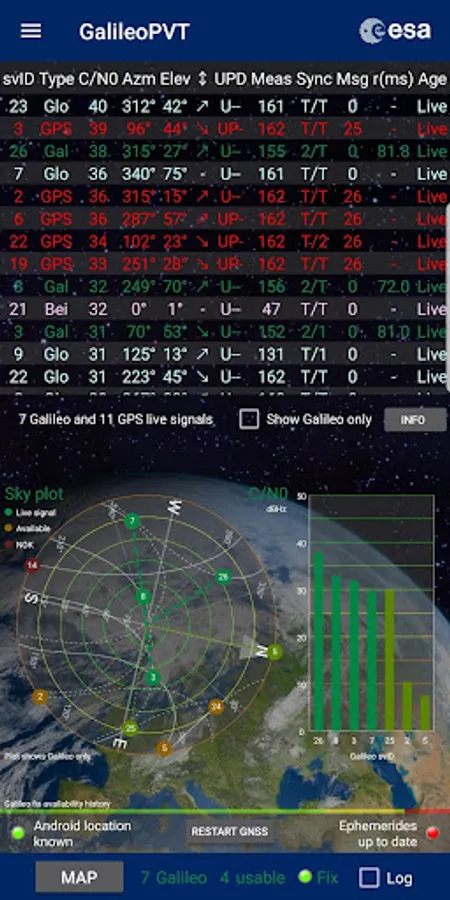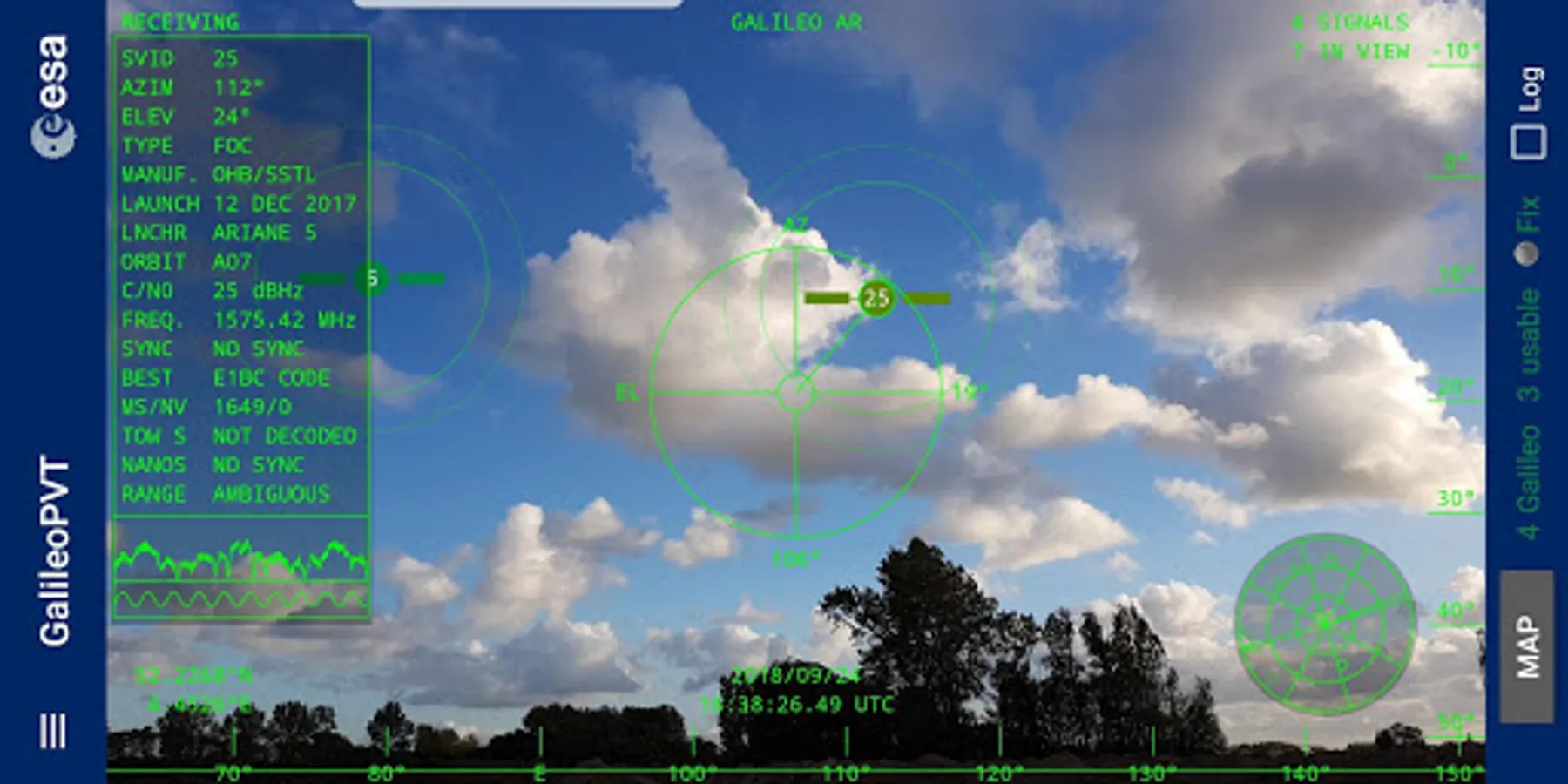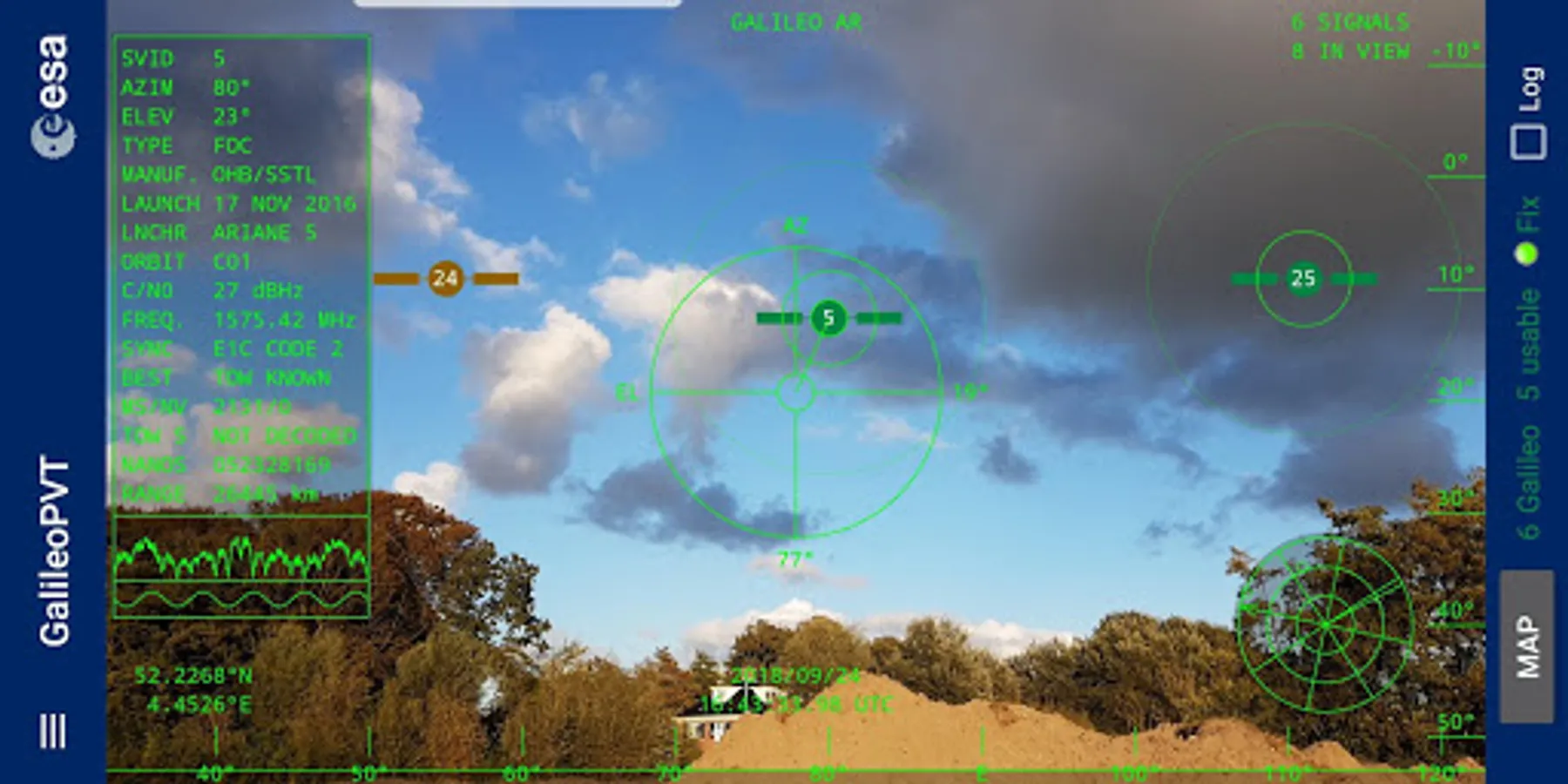An augmented reality view allows you to visualise the position of live Galileo satellites in the sky, as viewed by the device camera. This feature also works on devices that do not support Galileo, by plotting the predicted satellite positions if no signals are received.