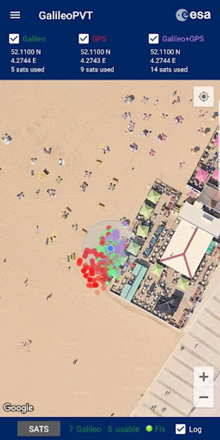 A comparison can be made with the GPS and internal Android calculated locations, with all points plotted on the map. Received signals are listed in a table (including signals from Glonass and Beidou, if supported by the device, as well as GPS and Galileo).