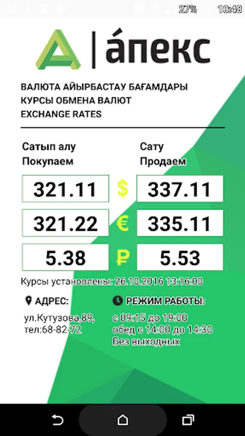 TOO Exchange Office "APEX". The program informs the user about the current exchange rates -dollar US, euro and Russian ruble tenge in the exchange offices of APEX in Pavlodar, Kazakhstan.