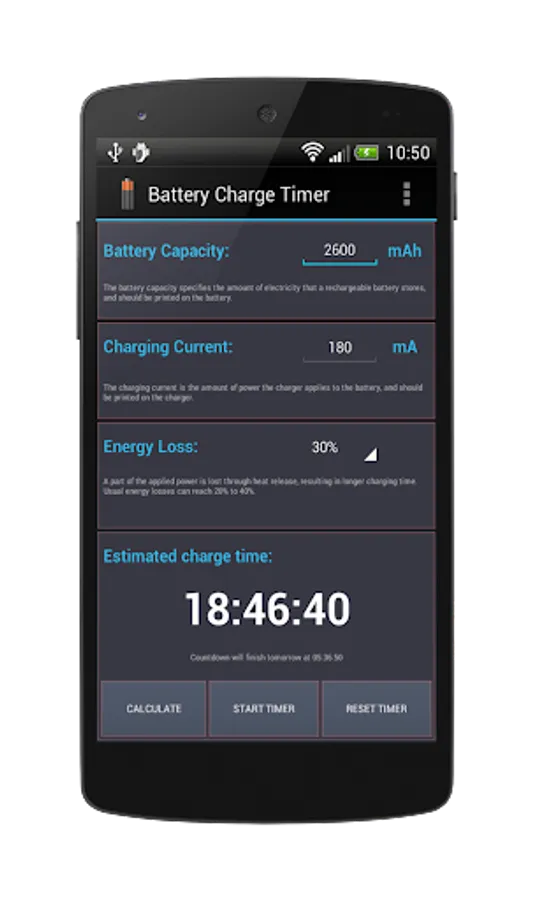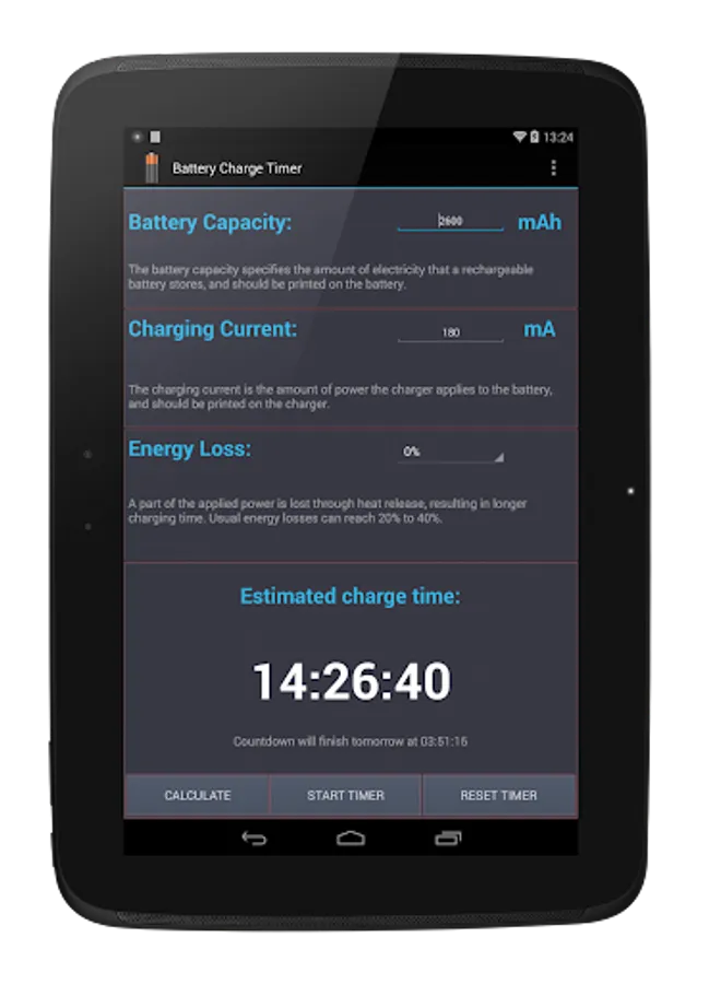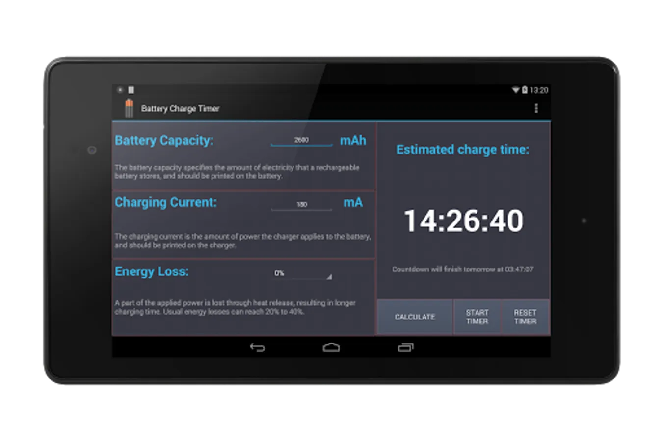 Battery Charge Timer allows you to evaluate the time required to charge your rechargeable batteries, depending on the battery capacity, the charging current and the energy loss. If you want to be alerted when it's time to disconnect the charger, you can set a timer to notify you. If you want to make the most of your rechargeable batteries, this app is for you!