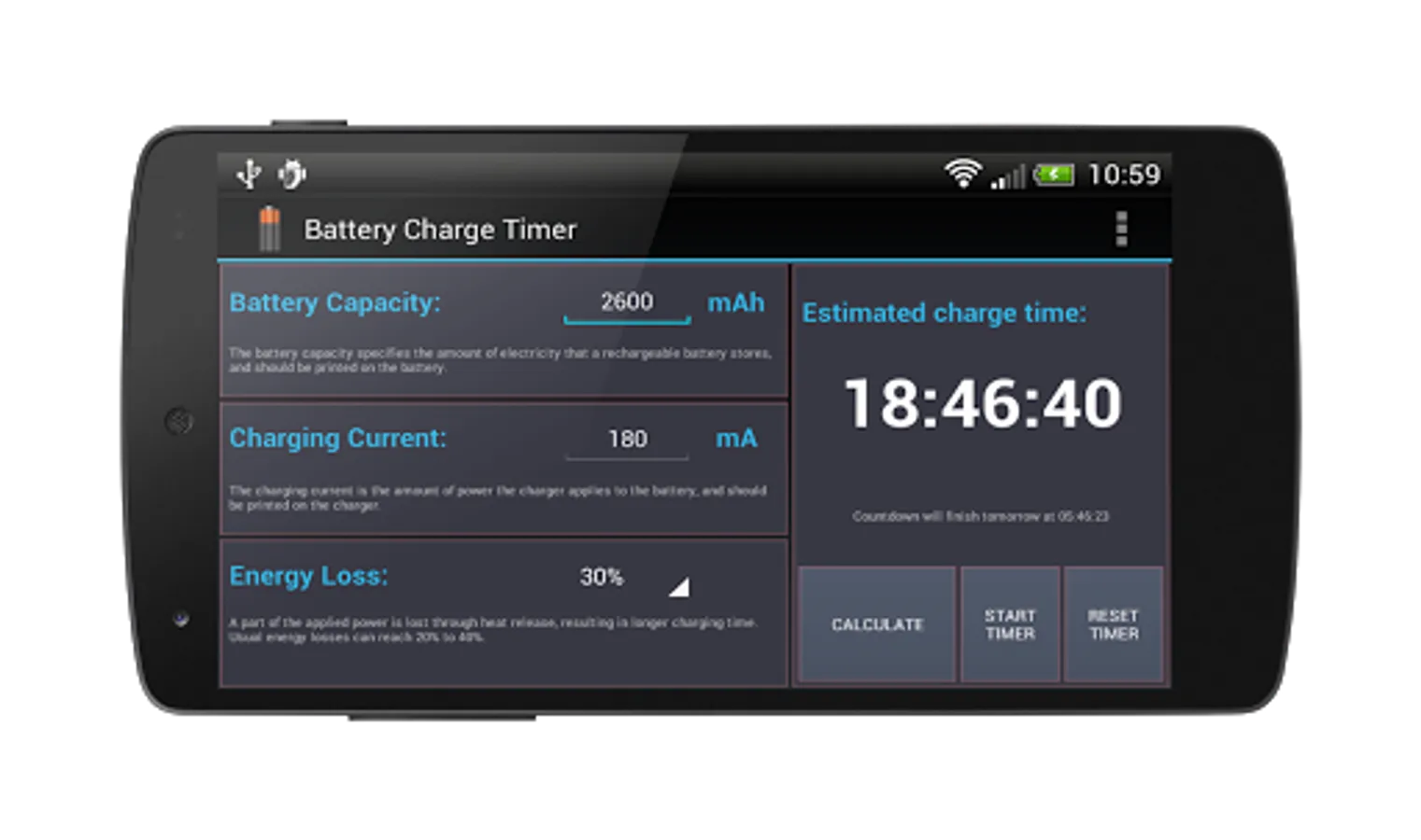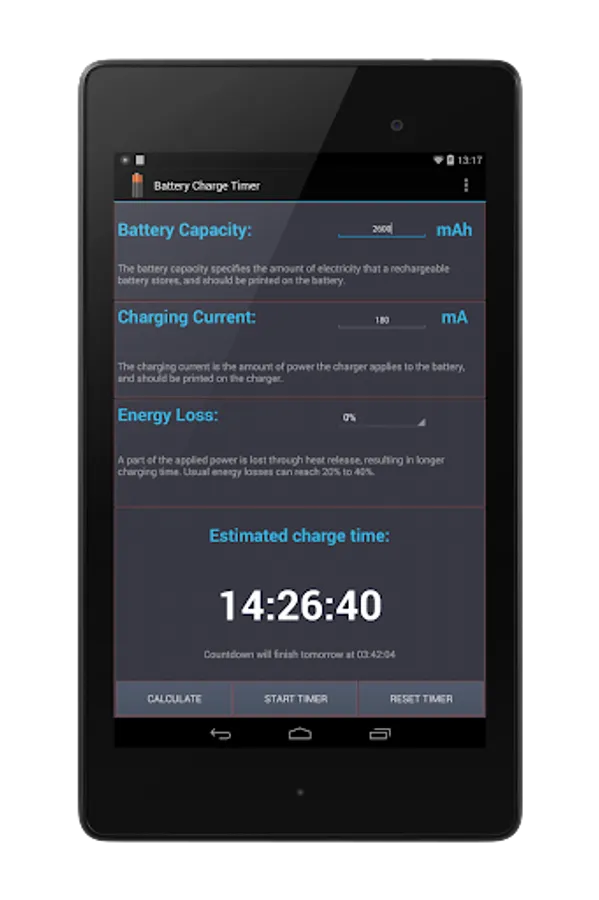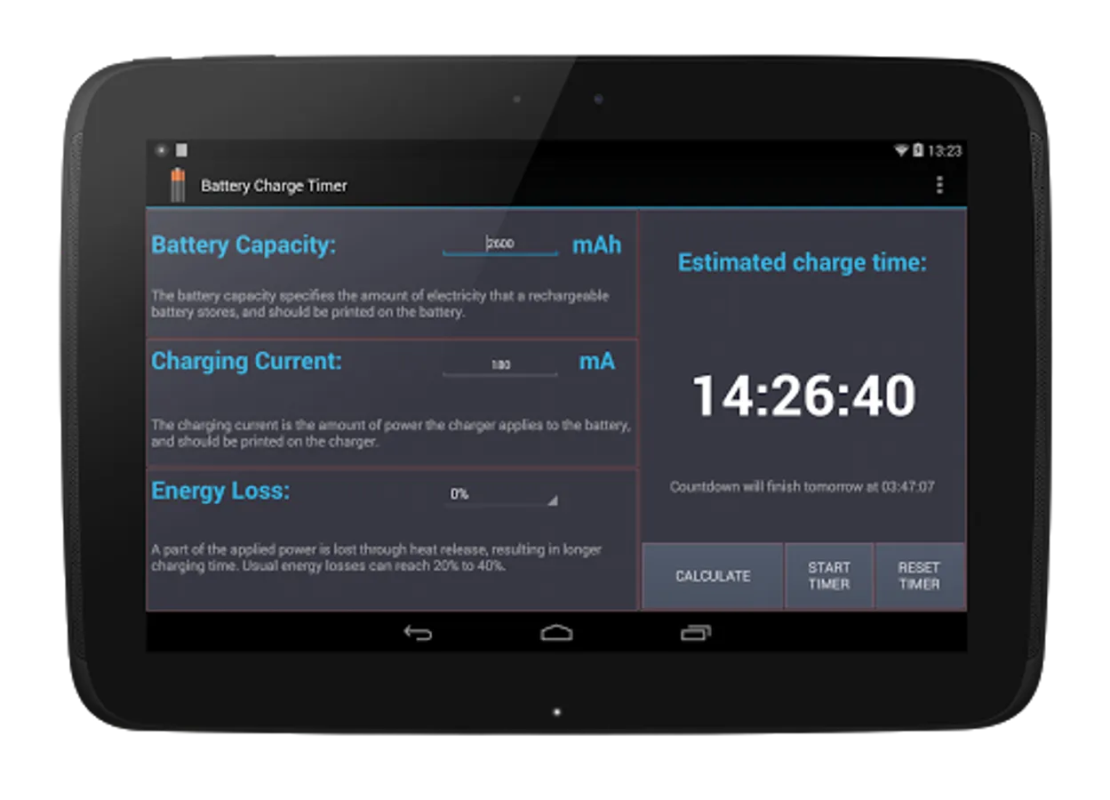 Battery Charge Timer allows you to evaluate the time required to charge your rechargeable batteries, depending on the battery capacity, the charging current and the energy loss. If you want to be alerted when it's time to disconnect the charger, you can set a timer to notify you. If you want to make the most of your rechargeable batteries, this app is for you!