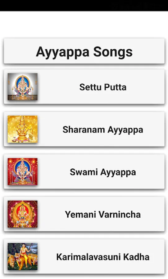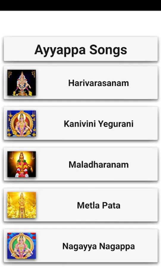 The app contains the following Ayyappa songs also known as Ayyappa paatalu (Ayyappa bhakti geetalu).