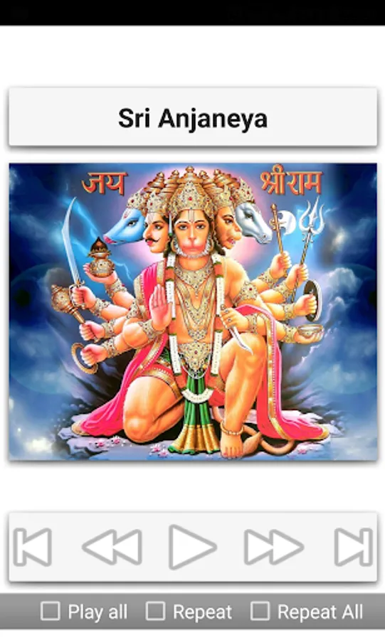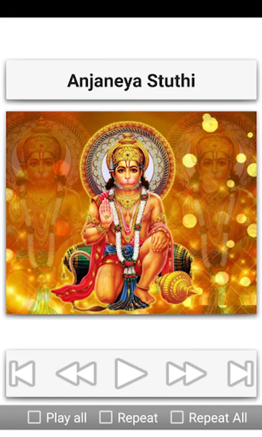 The app contains Hanuman Songs, Anjaneya Stuthi, Hanuman Stothram, Ramaduta Hanuman, Sri Anjaneya, Sri Anjaneyam, Hanuman Chalisa etc.