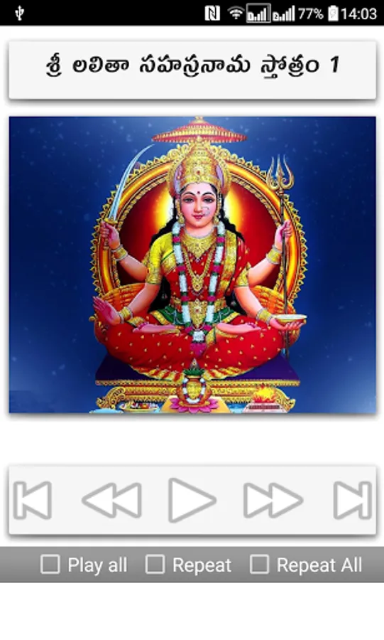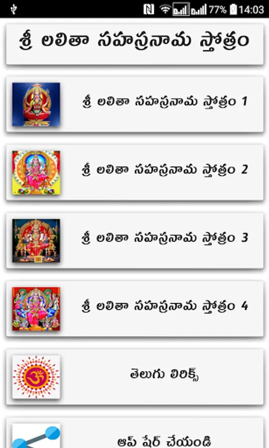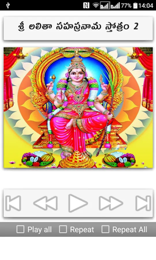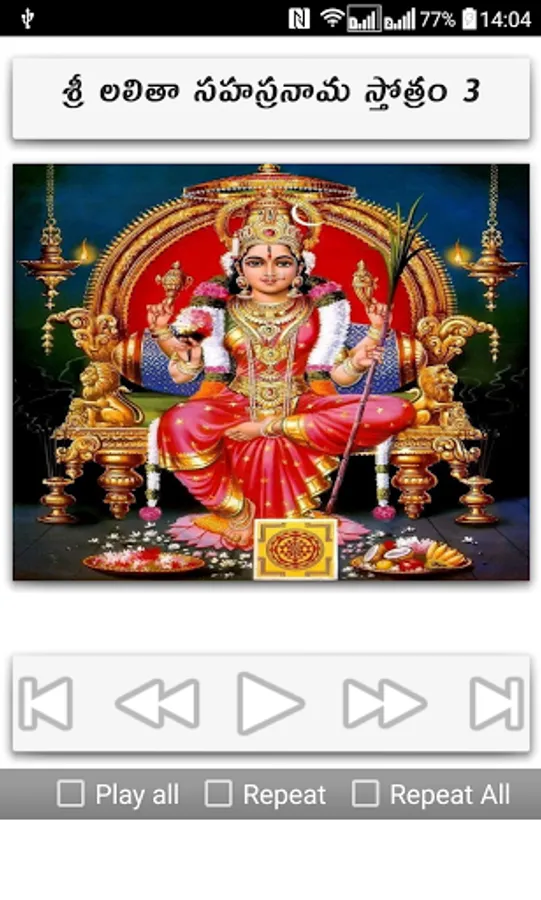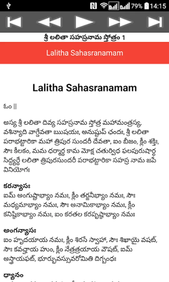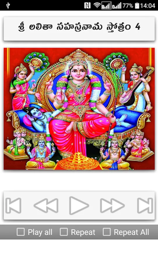 This devotional app contains Sri Lalitha Sahasranamam audio and Lalitha Sahasranamam lyrics in Telugu language.