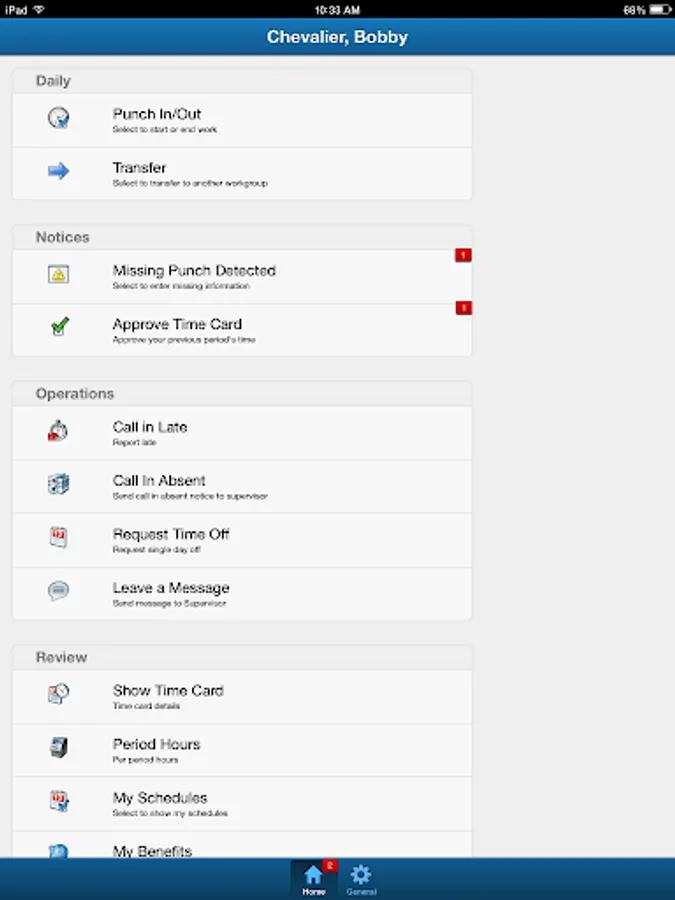You have access to the information you need to track your hours worked and review schedules or benefit balances. You receive notifications for when you need to take action. For example, adding a missing punch on your time card. You can also record attendance-related activities like an absence or if you will be late for your work shift.