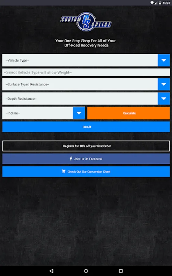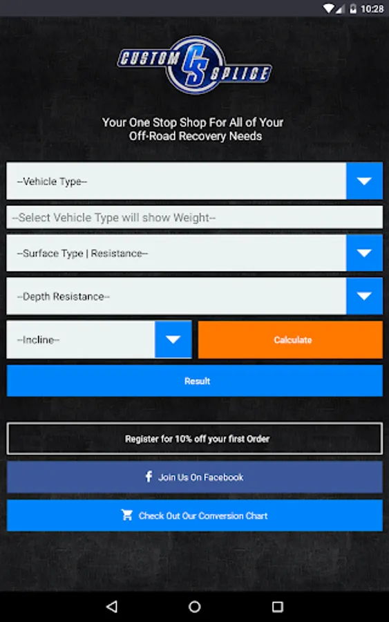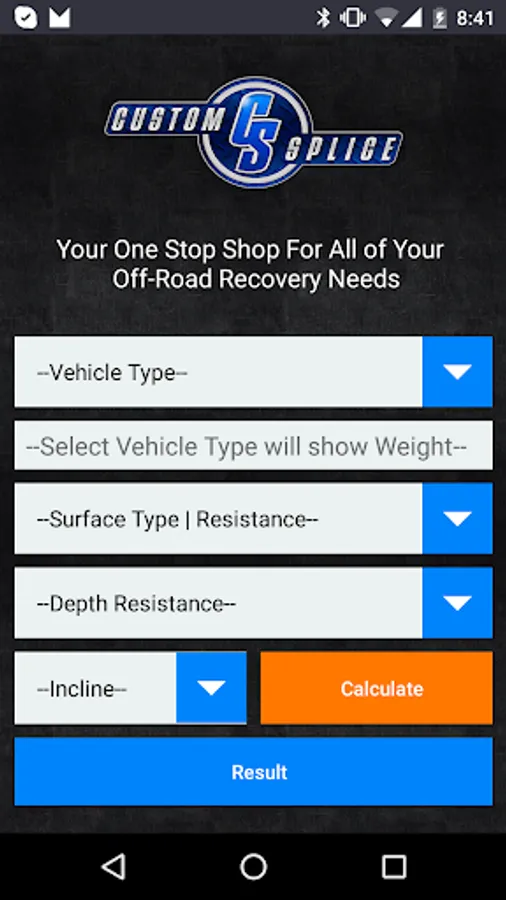 The Custom Splice Winch Recovery force Calculator is for estimating the force needed to Winch out a vehicle from a scenario in the real world. This does not account for all situations and cannot foresee all given situations, such as an axle stuck on a tree stump. The app assumes that the vehicle is immobile and cannot assist in its own recovery