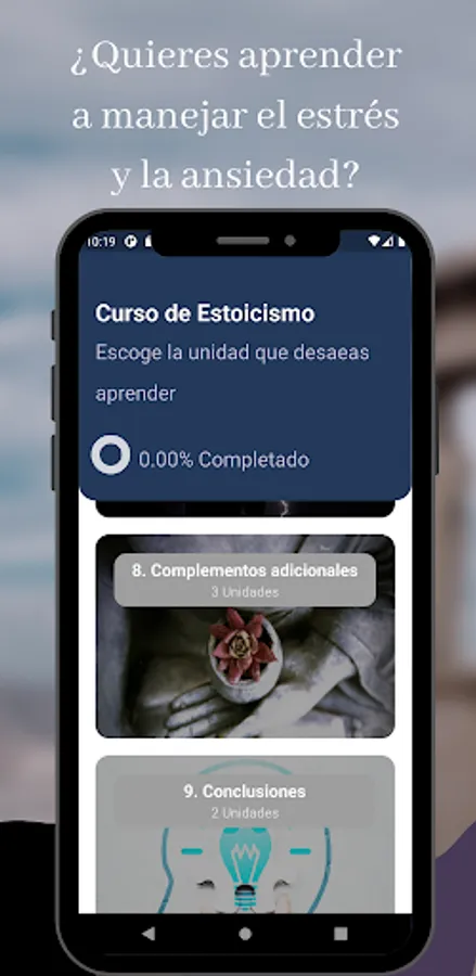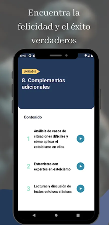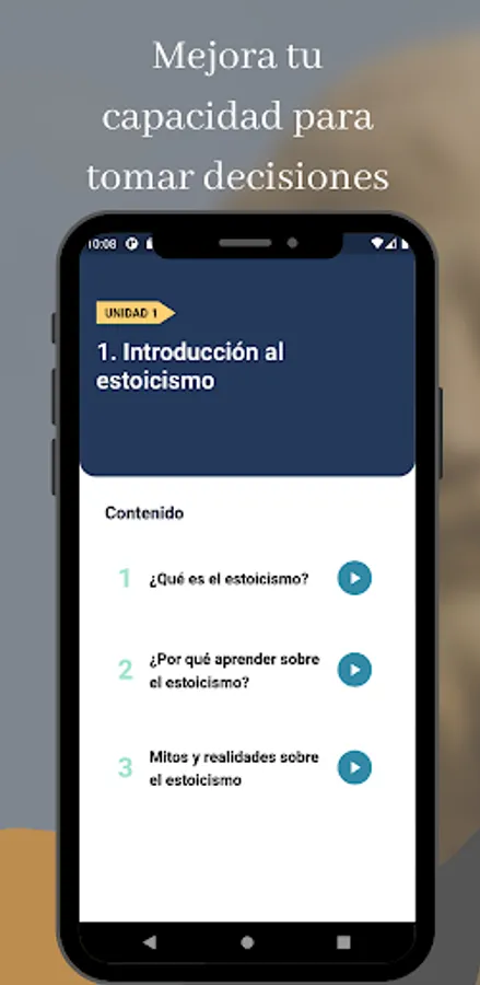 The first unit introduces the user to stoicism, its history and myths and realities about philosophy. In the second unit, the foundations of Stoicism are deepened, highlighting the importance of reason, virtue and the three stoic disciplines: ethics, logic and physics. In addition, it teaches how the practice of stoicism can improve life.