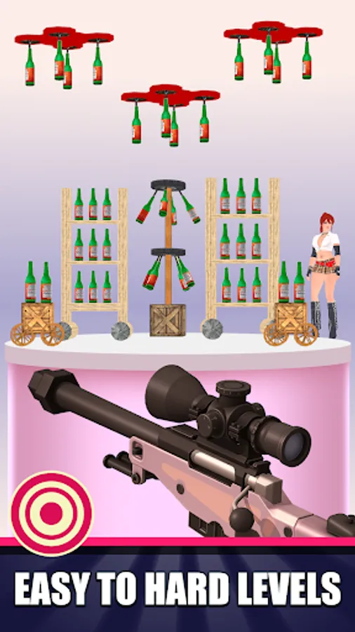 - Every level have bottles placed in different location and distance with a different number of bottle to fire to clear the level with sniper zoom and aim ability in sniper mission game.