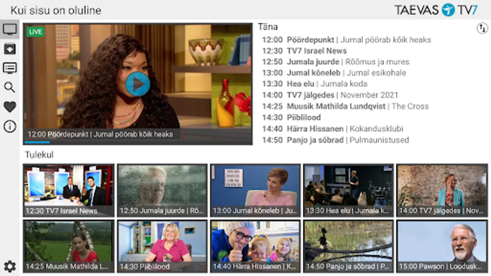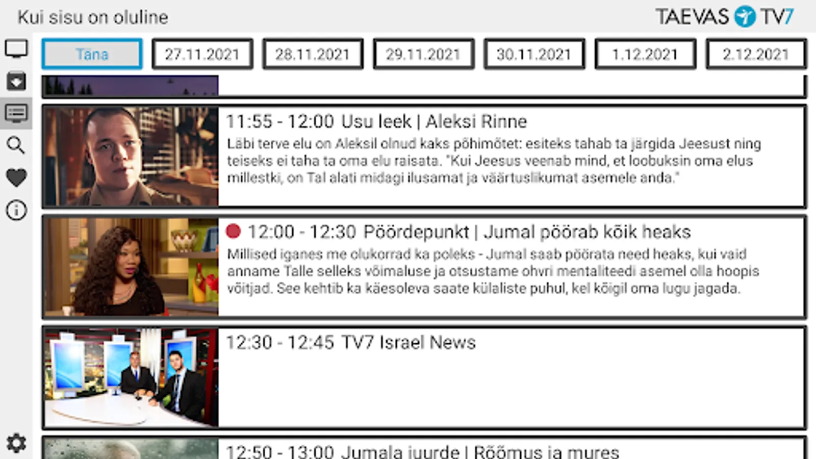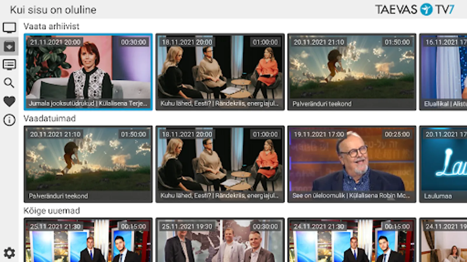 The application allows you to watch Taevas TV7 net TV, program archive and program schedule. The application allows you to search for programs in the archive.