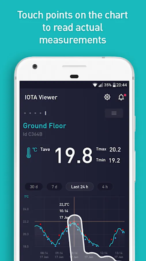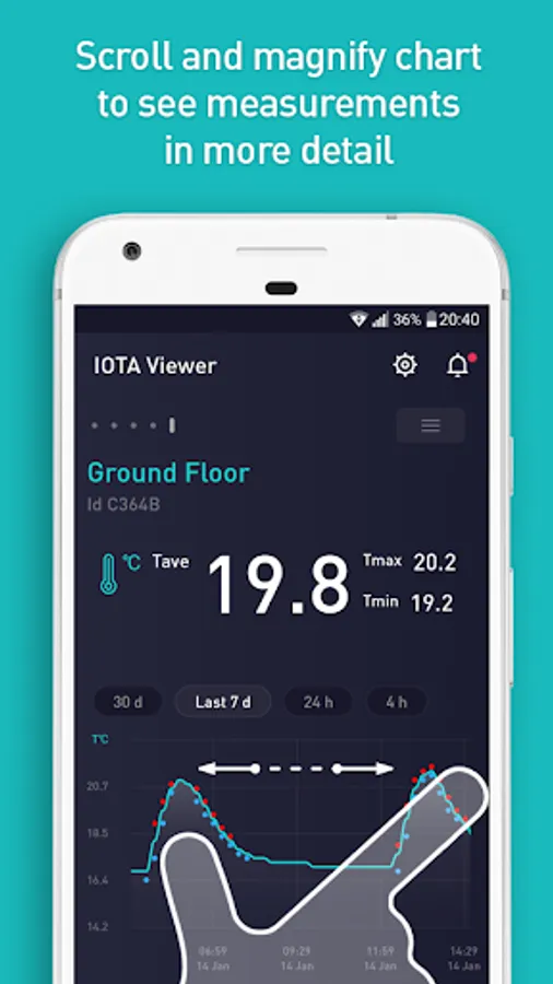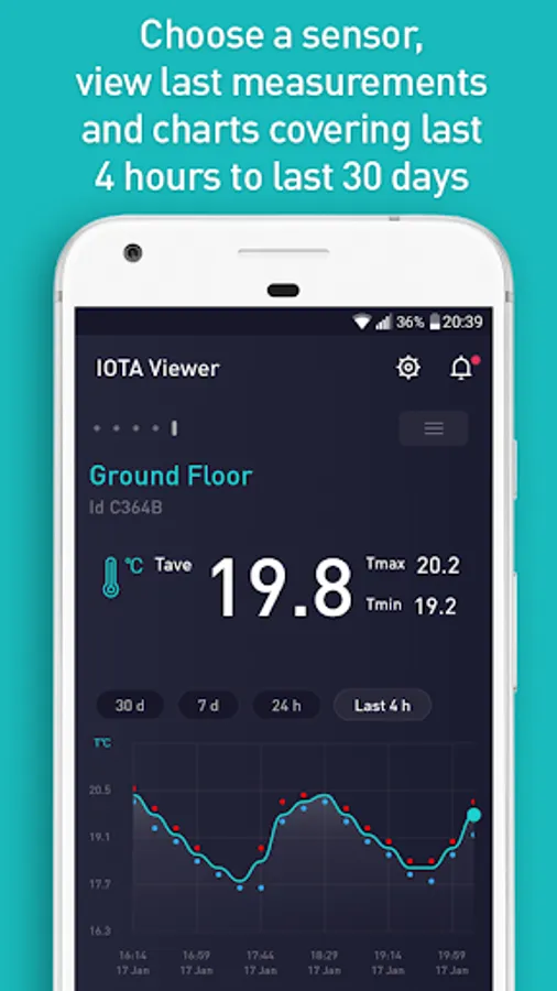 IOTA Viewer was designed to visualize messages generated by IOTA devices, which include various sensors with Sigfox wireless connectivity. Current version of IOTA Viewer provides access to measurements made by IOTA temperature and humidity sensors as well as various door and event-detecting sensors. Application allows users to connect devices using ID and passcodes provided with the devices and then view measurements or detected events on dynamic charts. Users may set alerts individually for each device and get notifications. For users’ convenience the devices can be individually named. Each user may have access to multiple devices and the same device may be accessed by many users, if they have access to correct ID and passcode.