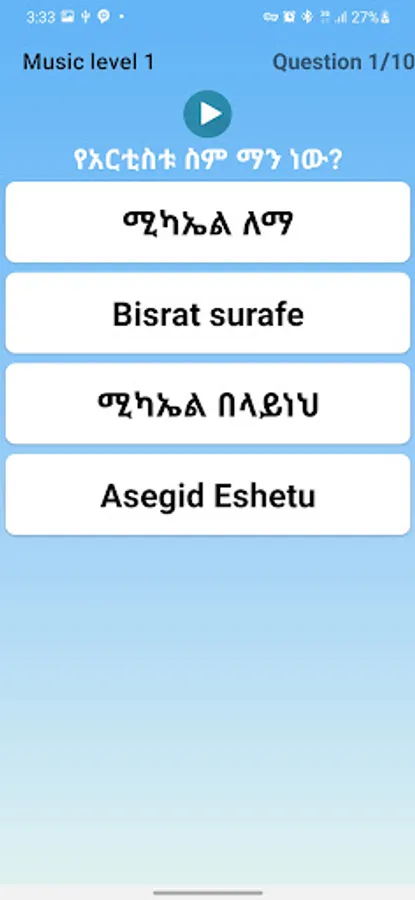 This Ethiopian Game Ethiopian music game that Ask you To identify who was the artist was and the song title by choosing the correct answer if you answer is correct it will pass to the other question.