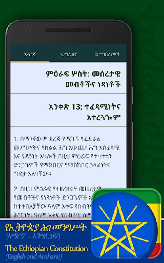 The constitution expressly provides for a set of basic human rights; Article 13 specifies that these rights and freedoms will be interpreted according to the Universal Declaration of Human Rights, the International Covenant on Civil and Political Rights and other international instruments adopted by Ethiopia. The document further guarantees that all Ethiopian languages will enjoy equal state recognition, although Amharic is specified as the working language of the federal government.