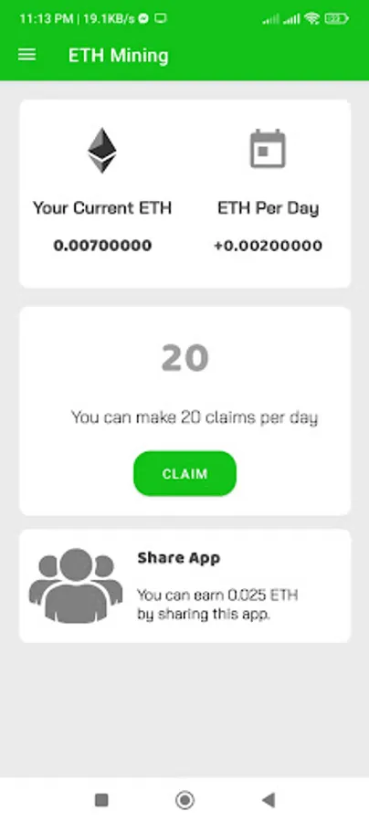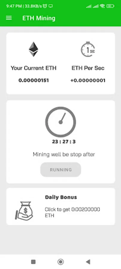 ETH Mining is an affordable and easy way to passively earn money using your mobile device: just install the app and start earning anytime, for free and without investment. You can earn etherium (ETH) very easily just useing this apps daily basis. This apps can gives you good amount of money for every mounth. You can earn etherium (ETH) for only doing some simple task. You can mining (ETH) everyday. and also you can earn some extra etherium (ETH) for doing some extra task. Those extra task is so easy for everyone. Also this apps is very easy to use. Everyone can use this apps very easily. This apps do not heat up your phone and it also does not affect any device. You can use this apps useing even a normal android smartphone and earn good amount of etherium (ETH) each mounth. This apps is highly safe for mining. So get ready to earn some etherium (ETH) useing your smart phone.