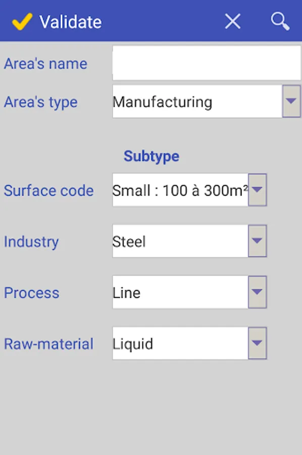 2) Parameter setting of the area to be audited. The 5S software will guide you in order to define the various parameters relating to the zone to be studied : factory or laboratory or store…; type of manufacturing or storage or other…; nature of the products, surface of the zone; etc.