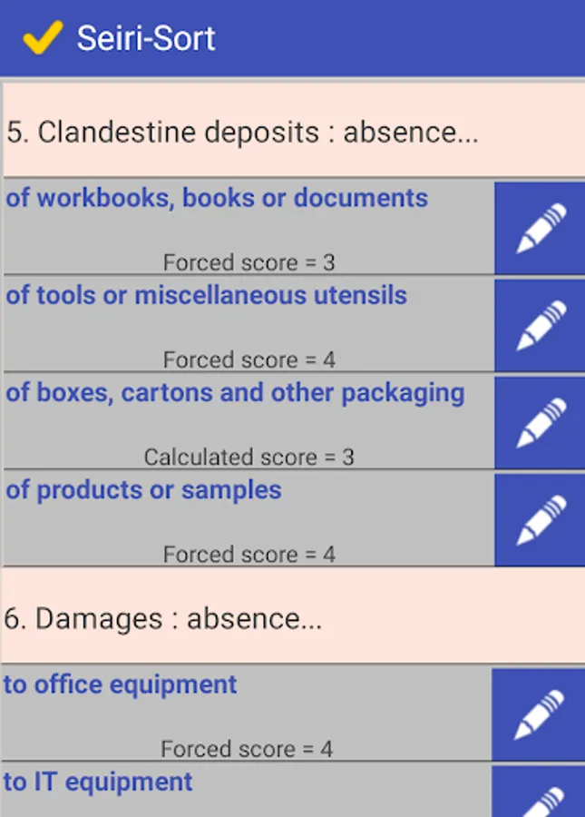 4)Registration of each finding in one of the 4S : seiri-seiton-seiso-seiketsu. It is possible to record an observation in several S. Each recorded finding will lose points, depending on the criteria used for the parameterization (the larger the zone, the more complex, the more dirty it is, the less the weight of a finding will be important).