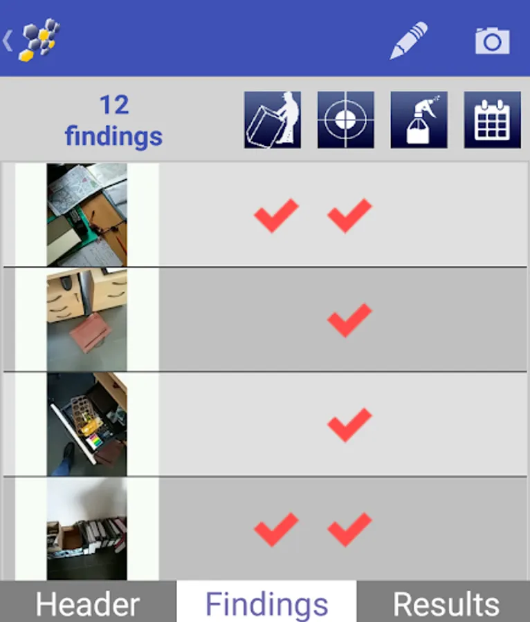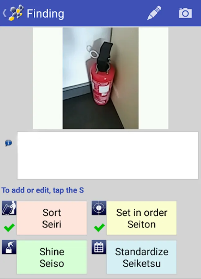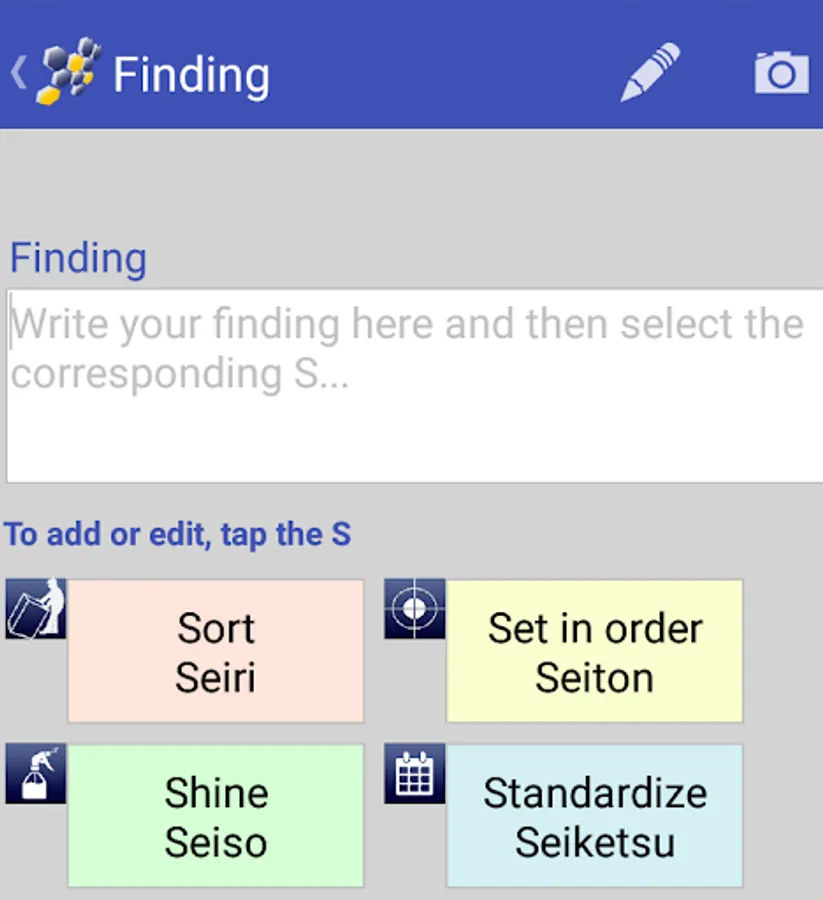 3)Performing of the findings : a finding is a field observation that is not in line with the prescriptions of the 5S method, the latter being included in lists of findings available in the 5S software.