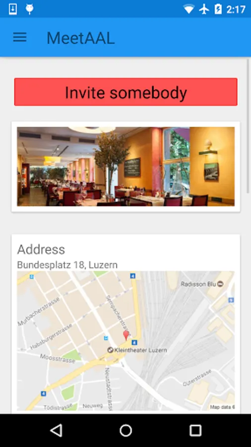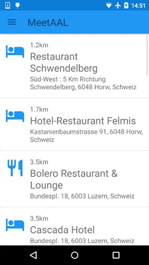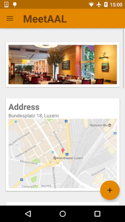 MeetAAL is a demo project created during the AAL-JP project "Zocaalo". The app displays places to meet (restaurants, bars etc.) and implements various demo fragments. The MeetAAL App makes use of the Styling Wizard and the Sync Framework. In this demo version, the user position is not taken into account - instead the app has some fixed locations where meeting places are dispayed, they can be switched in the preferences.