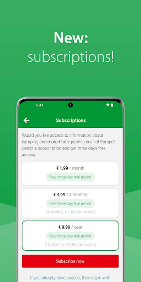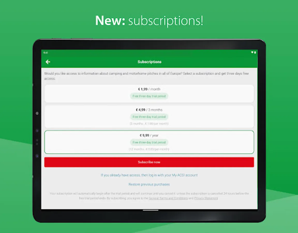 NOTE: access to the information in this app about campsites and motorhome pitches is not for free. In order to be able to use this information, you must take out a subscription. You can choose between a monthly subscription for €1.99, a 3-month subscription for €4.99 per quarter or a 12-month subscription for €9.99 per year.