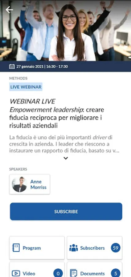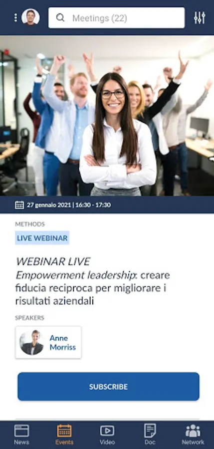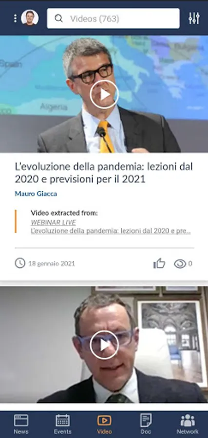 It is also possible to review the videos of all previous webinars and download the in-depth readings recommended for each topic. Under "My network" you can scroll through the basic information of all other members of the service, with references to the company and the position held and with the list of common participations in the meetings. A search engine integrated into the app allows you to search for content by filtering them by subject areas.