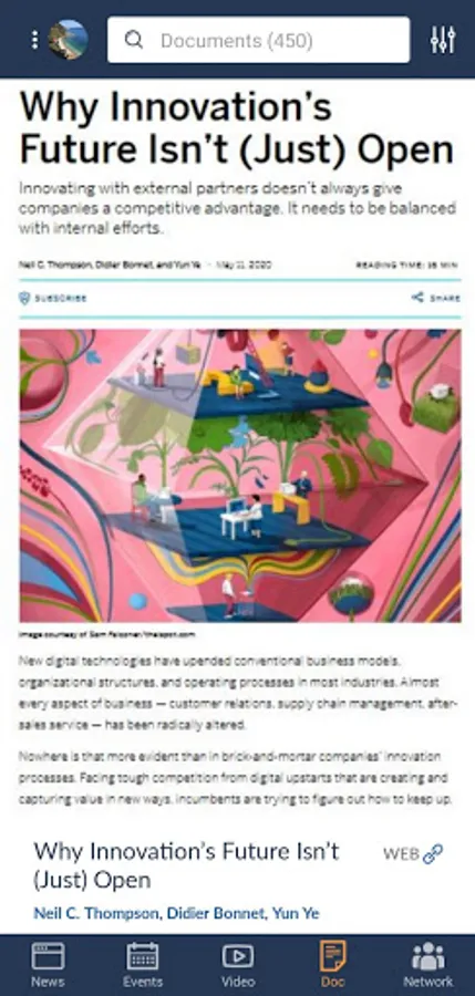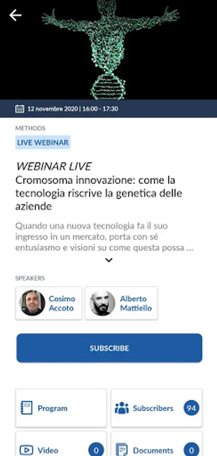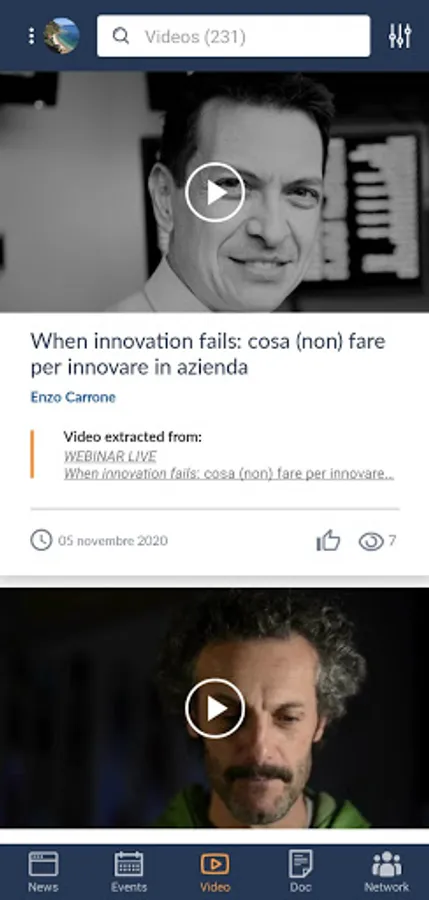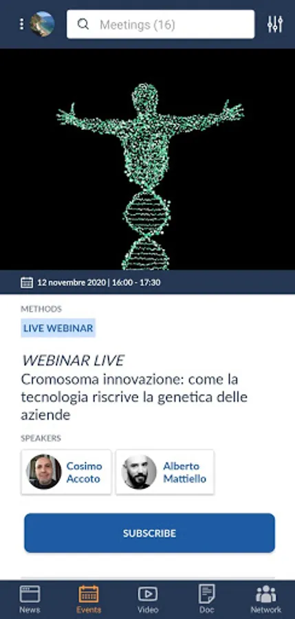 From the main menu, you can view the list of upcoming meetings, register, consult the kit, find out the details of the session, the speakers and view the map of the event location. It is also possible to review the videos of all previous meetings and download the in-depth readings recommended for each topic. Under "My network" you can scroll through the basic information of all other members of the service, with references to the company and the position held and with the list of common participations in the meetings. A search engine integrated into the app allows you to search for content by filtering them by subject areas.