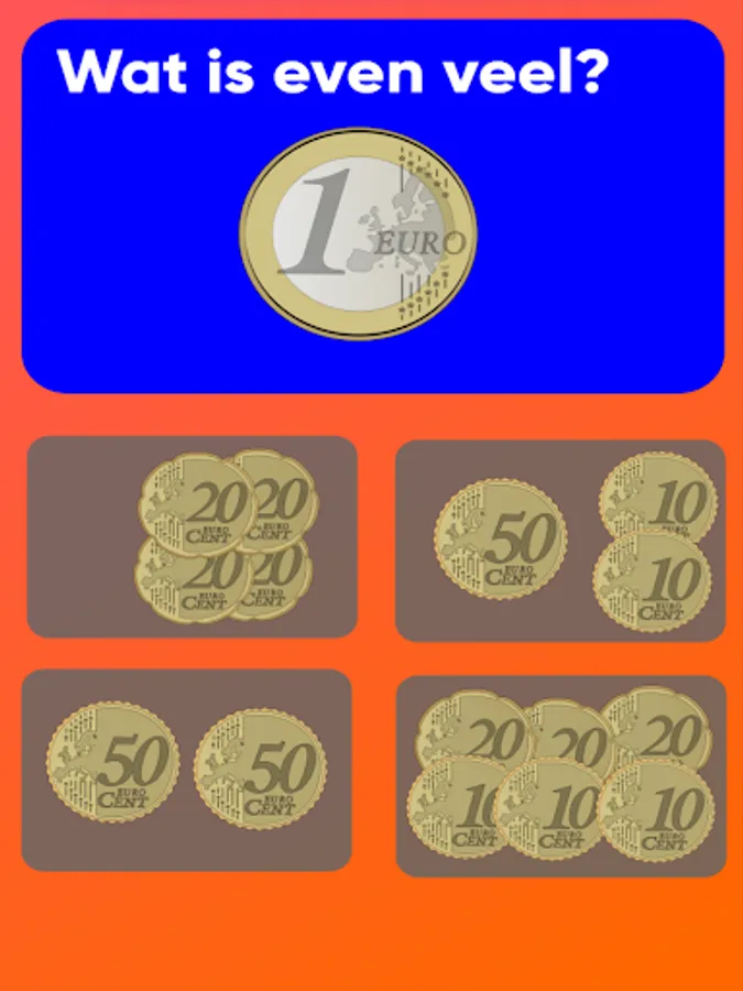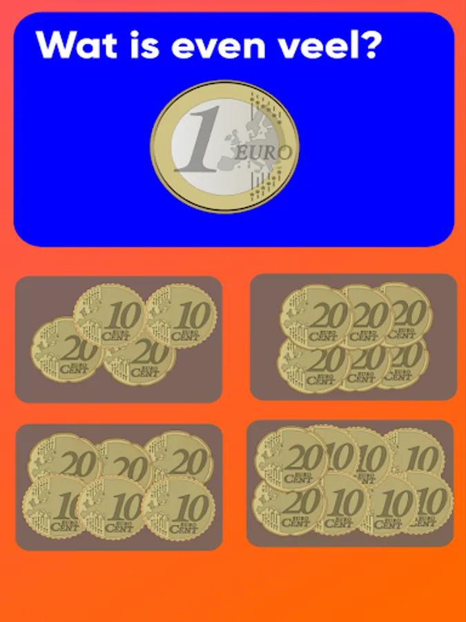 Practice counting with coins. The app contains more than 50 easy multiple choice questions with coins, divided into 6 levels that can be opened one by one.