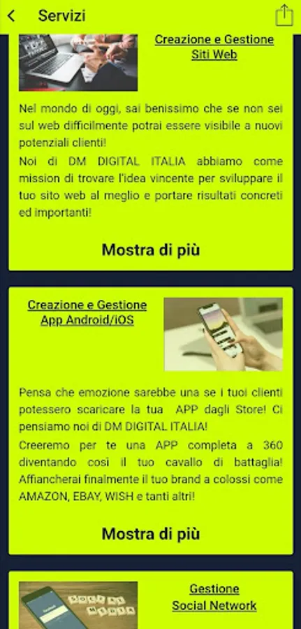 DM DIGITAL ITALIA was born from the idea of a young entrepreneur to make any brand smart and make it available in the pockets of all customers and potential customers! We get back together thanks to our innovative technologies, proposing various solutions based on the needs of each of our customers! Our only goal is to always keep up with the times and to gradually become one of the leading companies in the communication and Social Media Marketing sector!