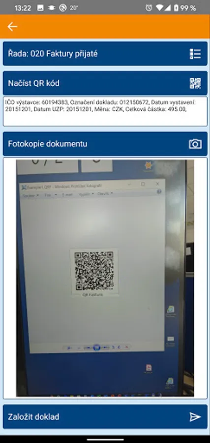 Mobile client ERP system HELIOS Orange for quick insertion of documents such as invoice QR code according to the standard QR invoice. At the same time, it is possible to establish even a photocopy of the document.