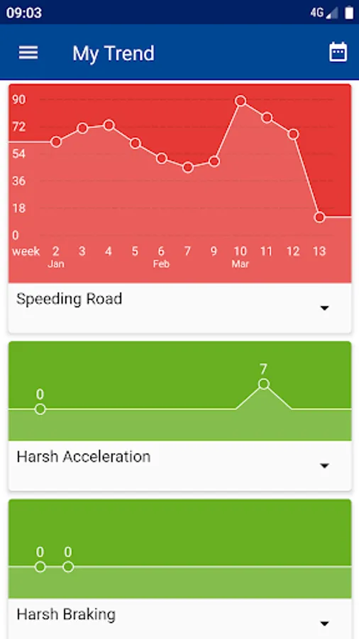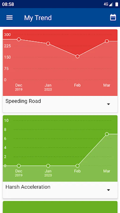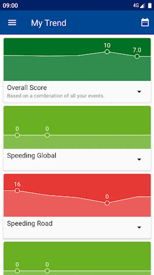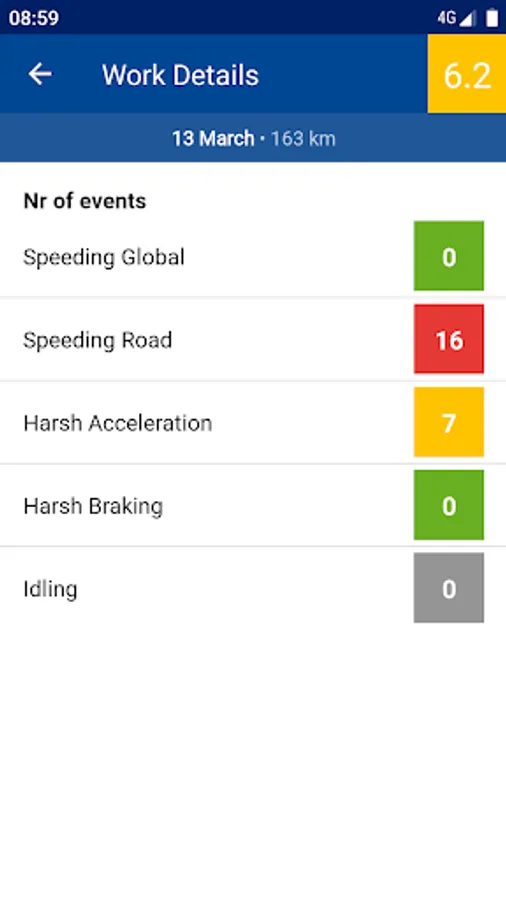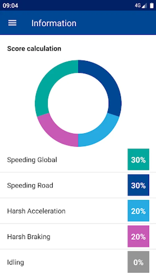 Trip summary with your overall score and KPI's such as overspeeding, harsh acceleration, idling, etc.
