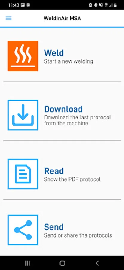 WeldinAir app allows to communicate with the +GF+ MSA electrofusion compatible units using Bluetooth connectivity. WeldinAir app is designed to offer the possibility to collect all relevant information necessary to document that the welding process has been done properly and following the correct procedures.