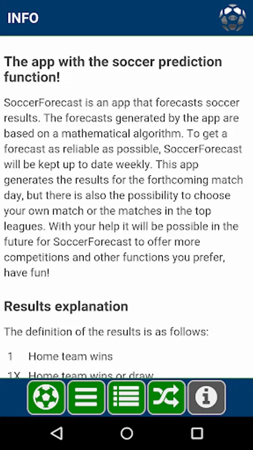 The forecasts generated by the app are based on a mathematical algorithm. To get a forecast as reliable as possible, SoccerForecast will be kept up to date weekly.