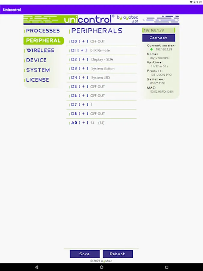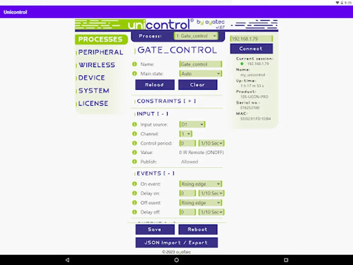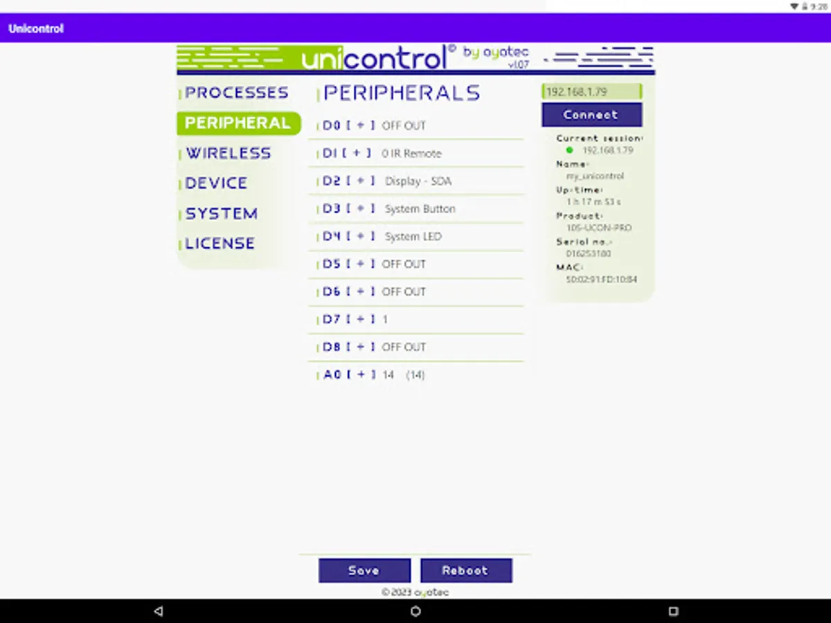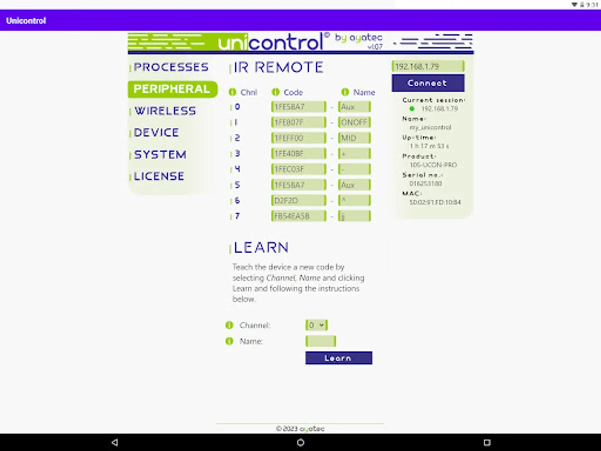 An Android version of the ayatec web-based interface serves as the primary tool for setting up and debugging unicontrol devices during installation.
