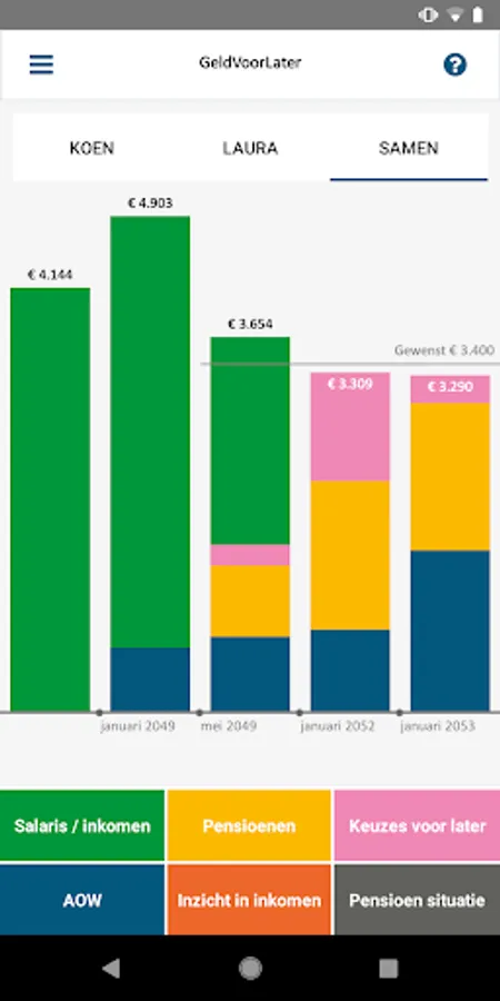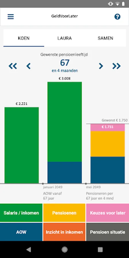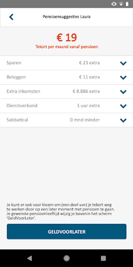 But more importantly what you can do now in the event of a shortage. The app provides information, insight into your personal financial situation and actions to adjust your income for later now. The GeldVoorLater app helps you to make pension decisions with confidence and thus consciously take a piece now to later. The app is for everyone who wants to get started with their retirement.